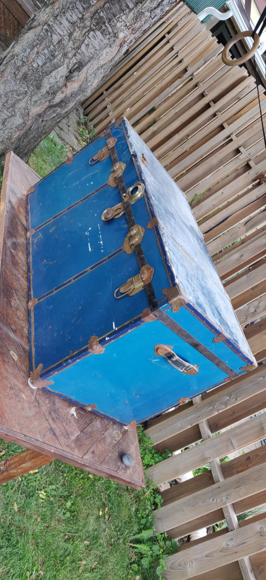 A very cool old trunk, maybe you have the space and taste for it! One of the leather handles is torn, and it's definitely old- the kind of thing you don't find everyday!