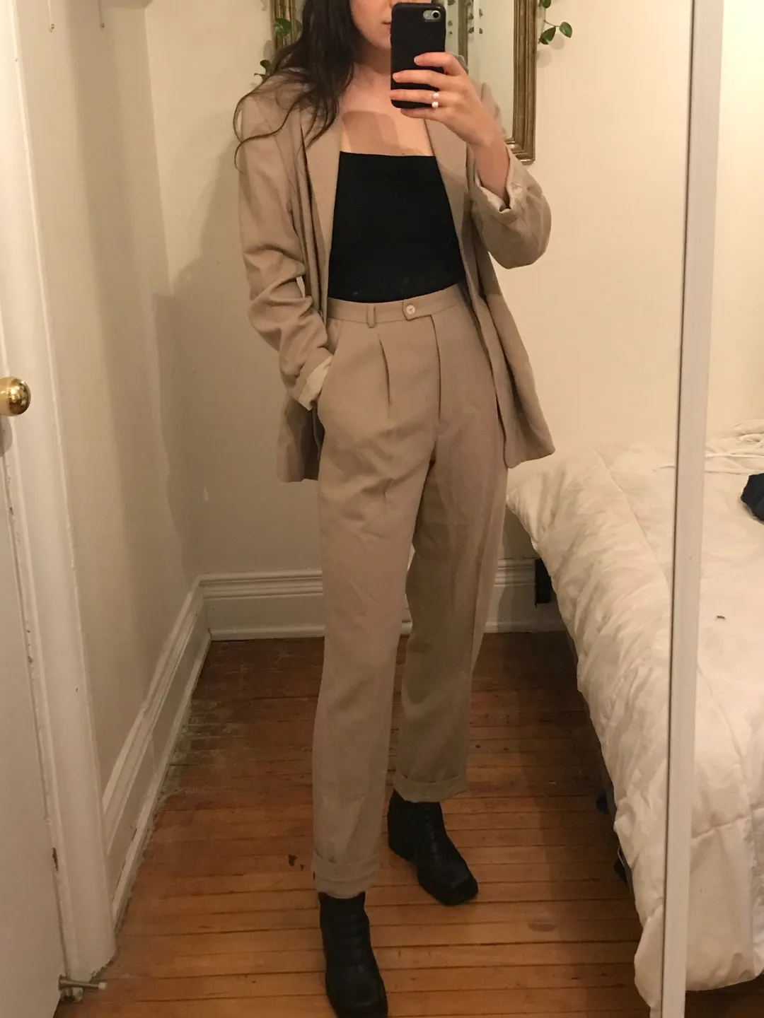 Marked size 6, jacket fits S/M and pants fit small. 27 W and fairly long, they’re rolled in photo and I’m 5’7. 2 small pinholes on the back shoulder of the blazer but other than that in great condition! Made in Canada