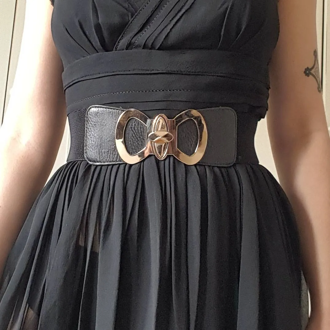 Pretty black and golden waist belt! Stretchy elastic material, the buckle has some scuffs and scratches so not looking for too much. Would most comfortably fit between a 22-28 inch waist, though it stretches a tiny bit further than that.