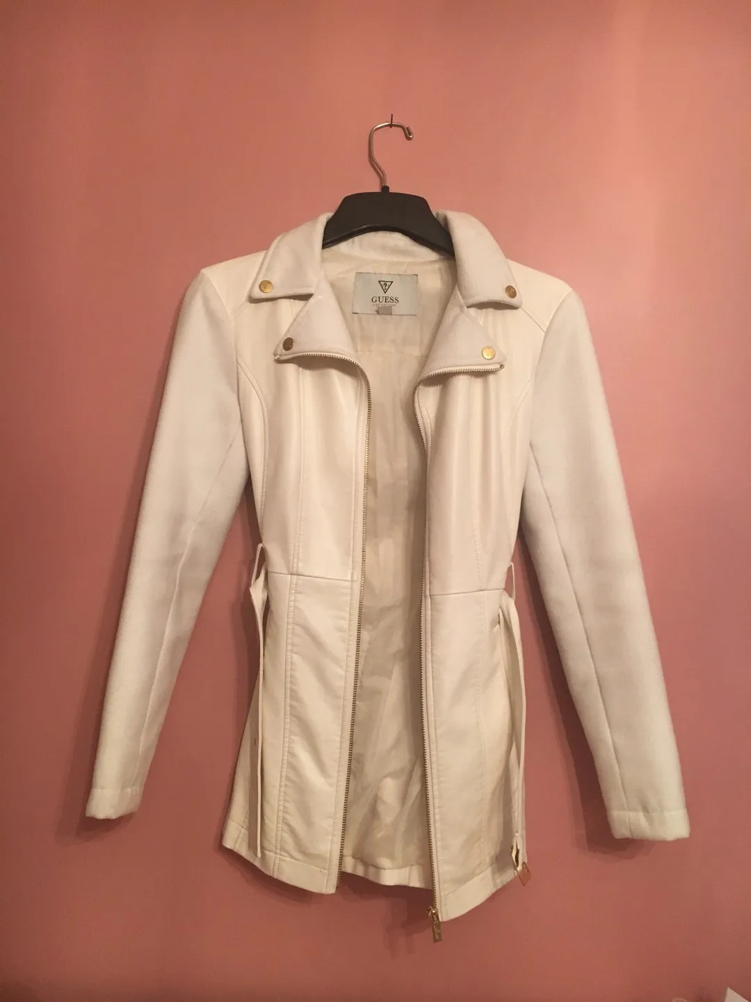 Softer material for the sleeves and then fake leather for the body and belt! Gold accents. This has been well-worn by me but still lots of life left! Works so well as a fall and winter coat.