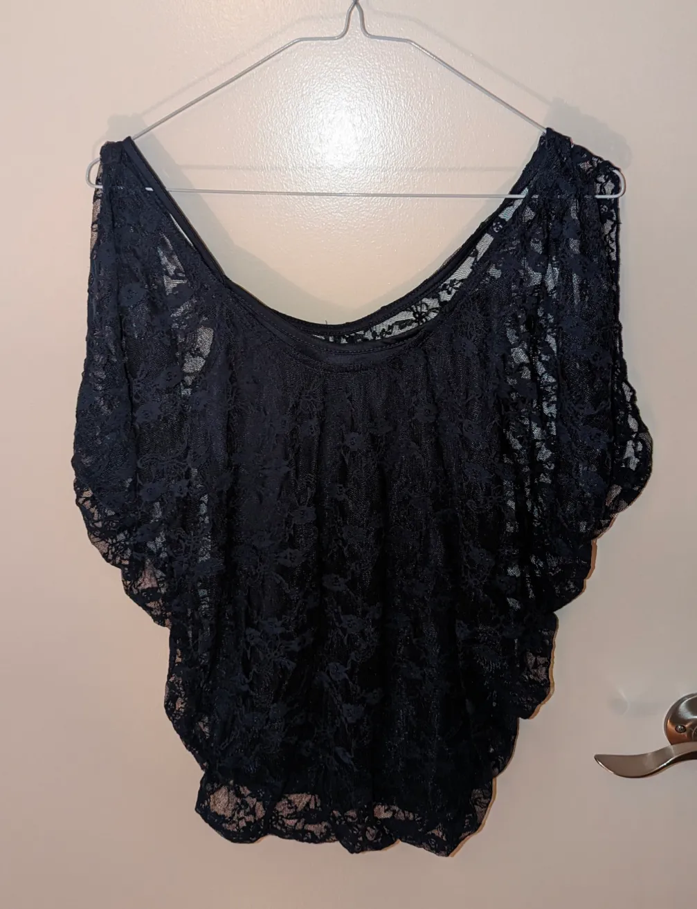 A beautiful navy lace top! It's in great condition and ready for a new home. The lace detailing is lovely, and the style is quite flattering. Perfect for dressing up or down!