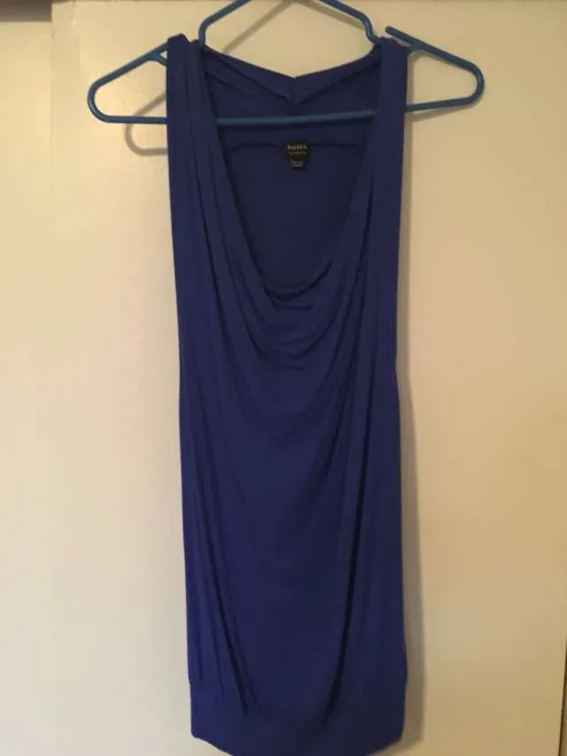 Loose bright blue tank with long sleeve holes. Size xxs but definitely can fit bigger due to stretch.