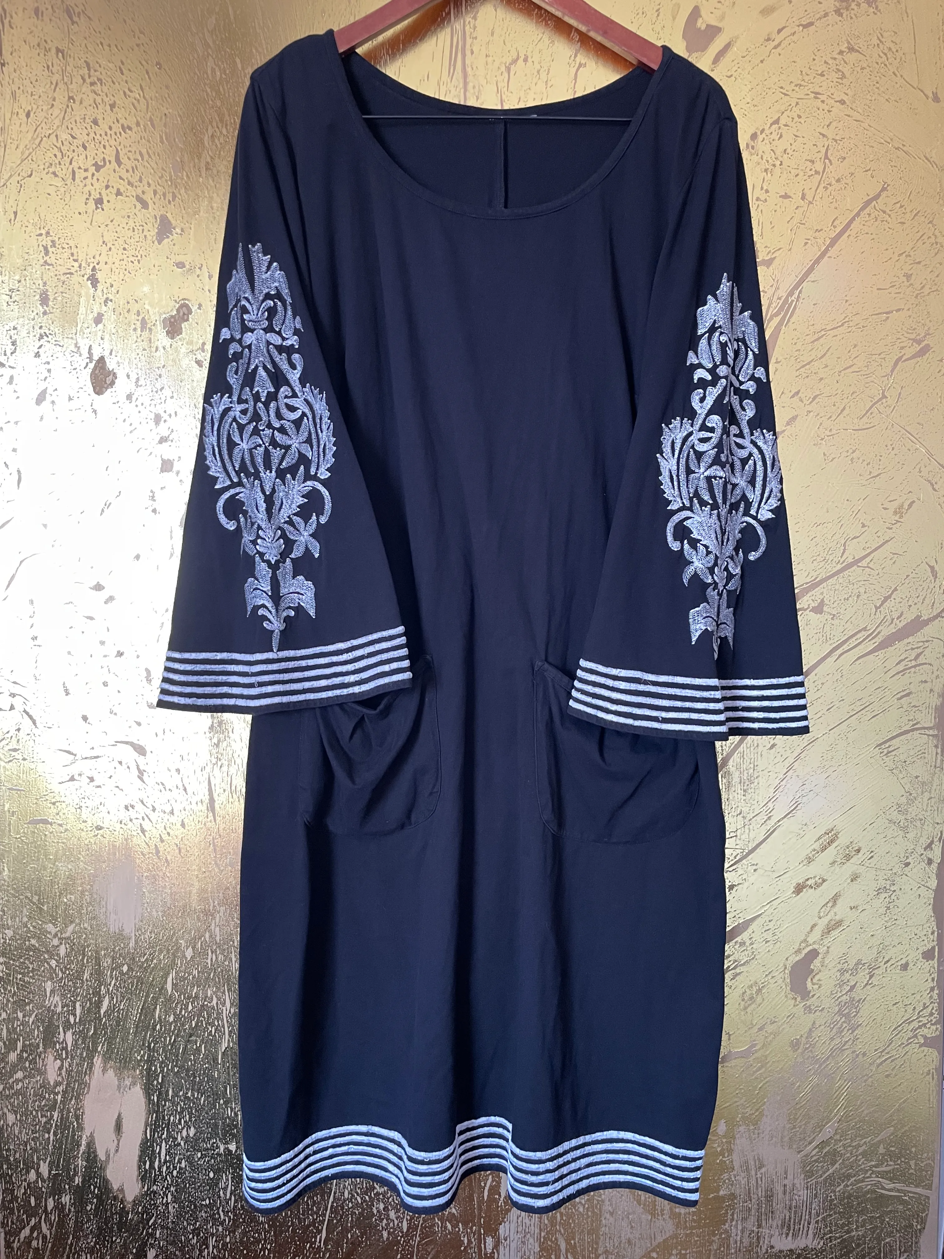 Very flattering vintage cotton jersey dress with beautiful embroidered sleeves and pockets!