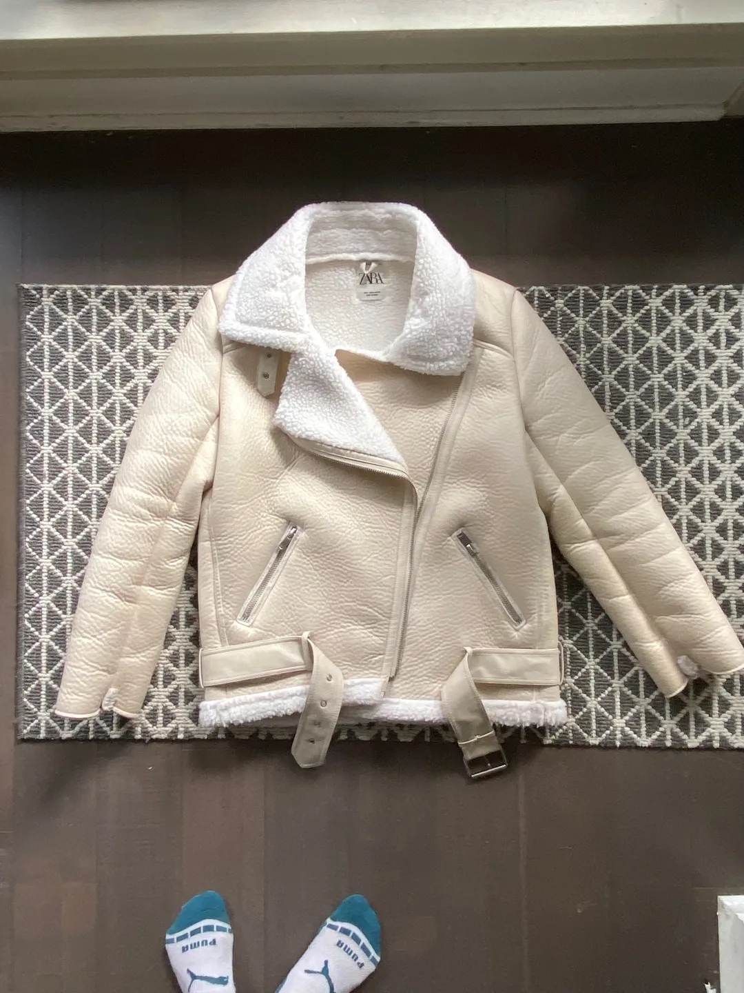 Size M, fits oversized. I'm a 6/8 and it's very comfortable and warm. Worn lightly for one season, conditioned and washed. Some wear on the inside where the belt is but otherwise EUC. ISO $50 value