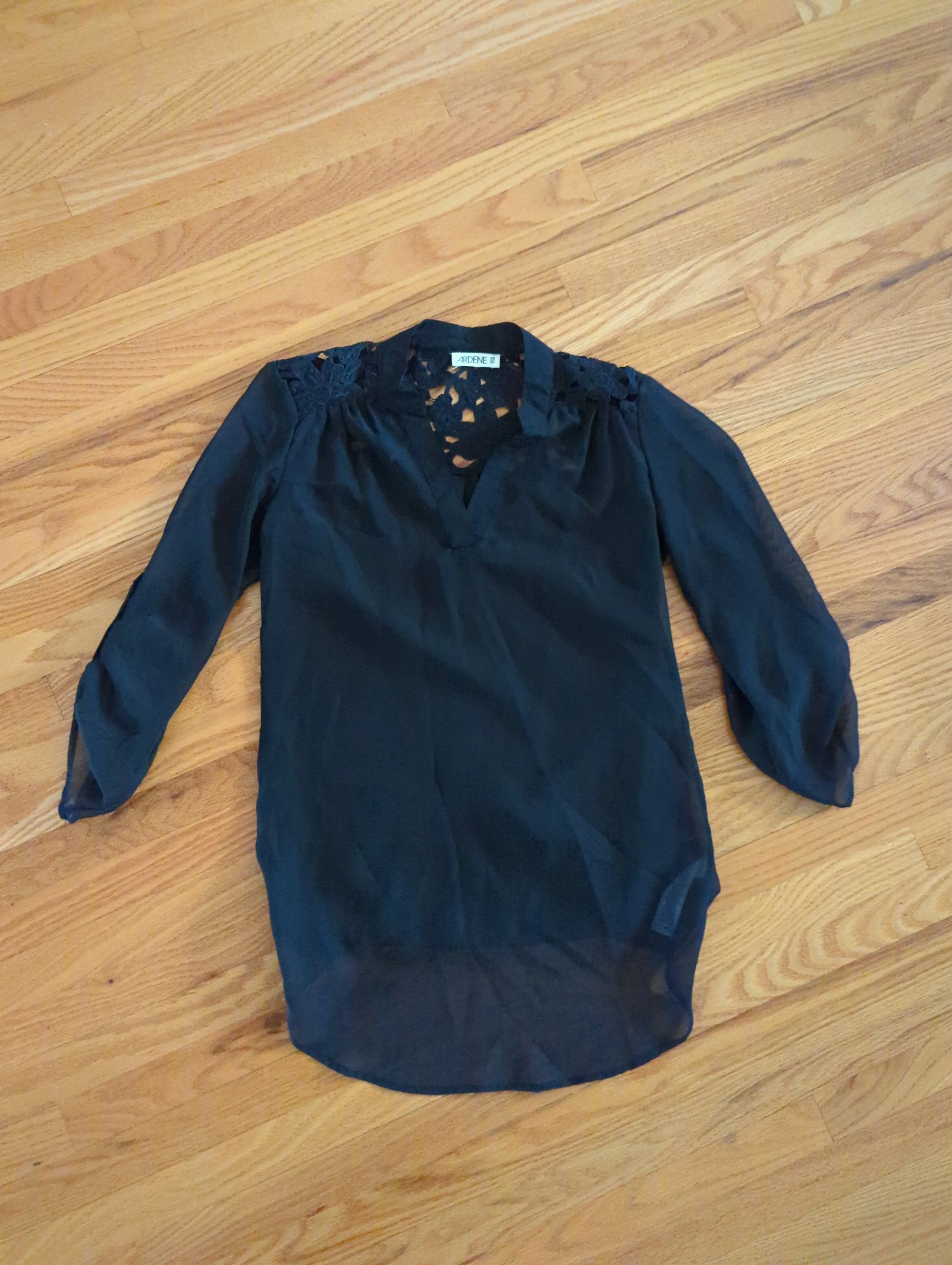 Black sheer blouse with lace detailing at the neckline. Three-quarter length sleeves.