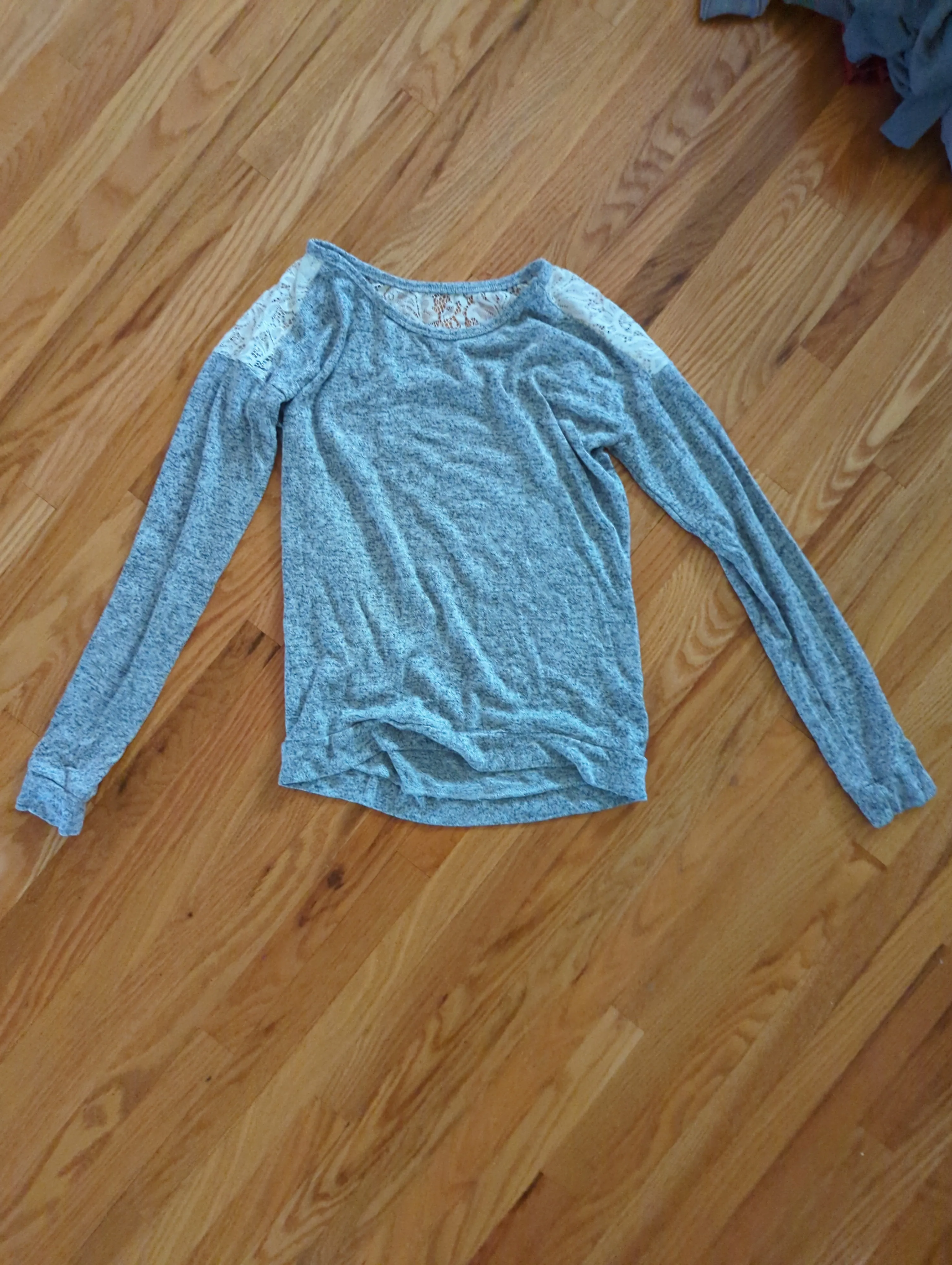 Grey long-sleeved shirt with lace detailing at the neckline and shoulders. Soft material. Great for layering or wearing on its own.