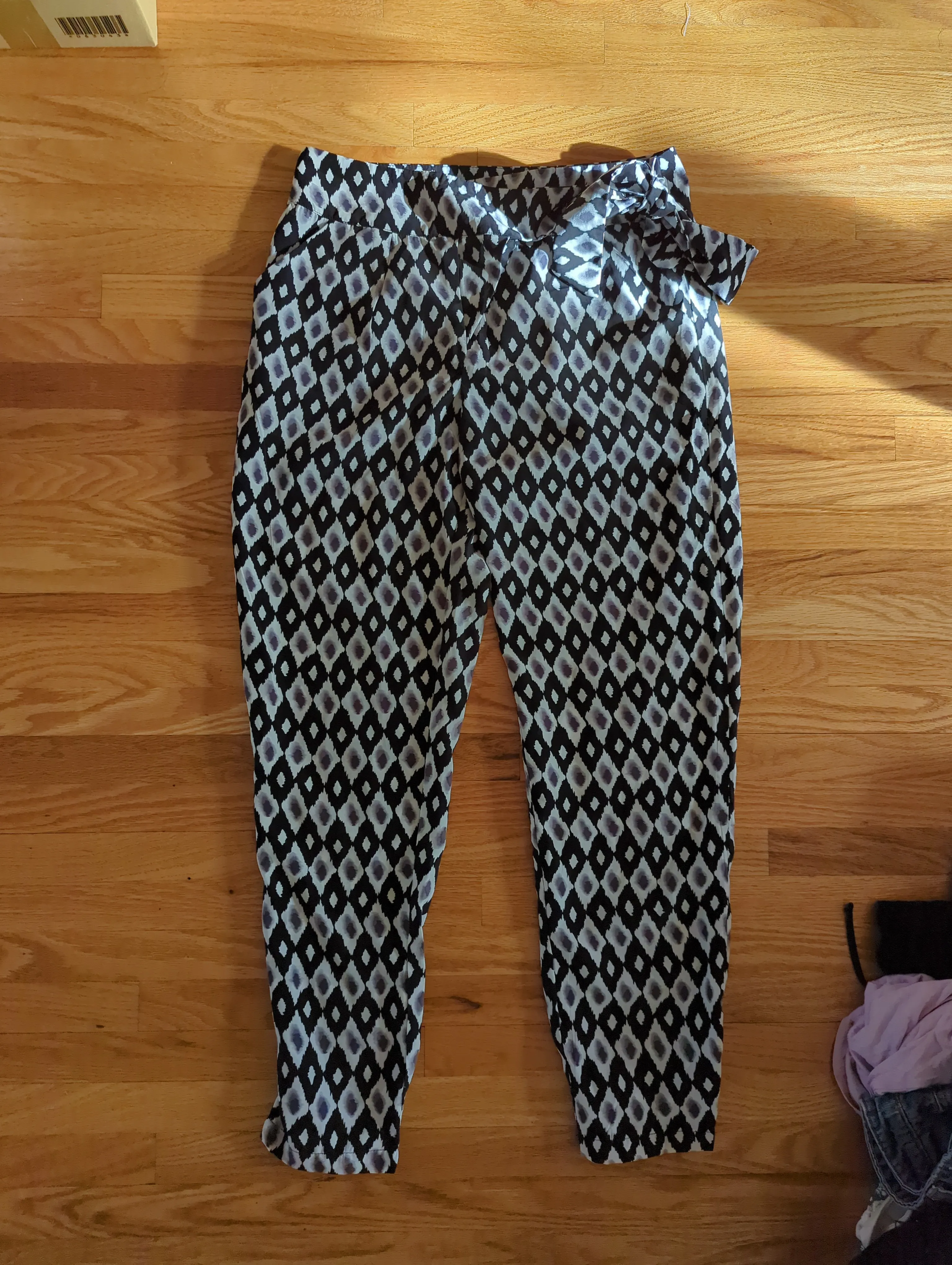 Lightweight patterned pants. Black and white geometric design. Side pockets.