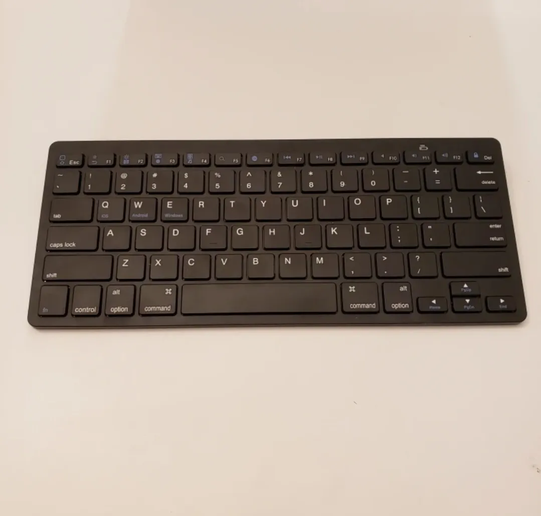 Bluetooth keyboard for phones, tablets, anything. Small and portable. Requires 2 AAA batteries. Works great, but I bought a larger one with a number pad.