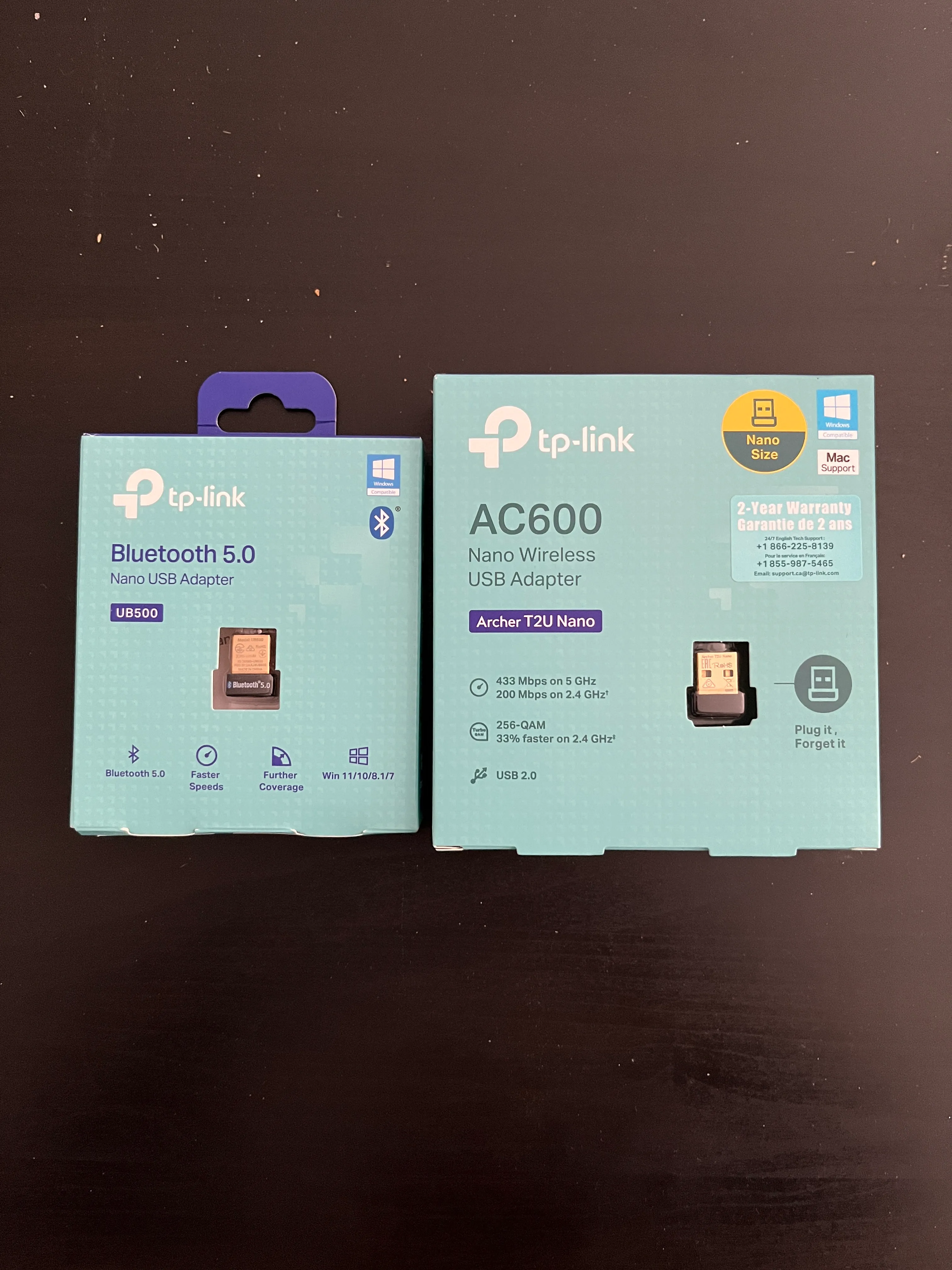 New TP-Link bundle. Includes AC600 Nano Wireless USB Adapter and Bluetooth 5.0 Nano USB Adapter. Both are small and easily portable. Great for laptops and desktops. Excellent condition.