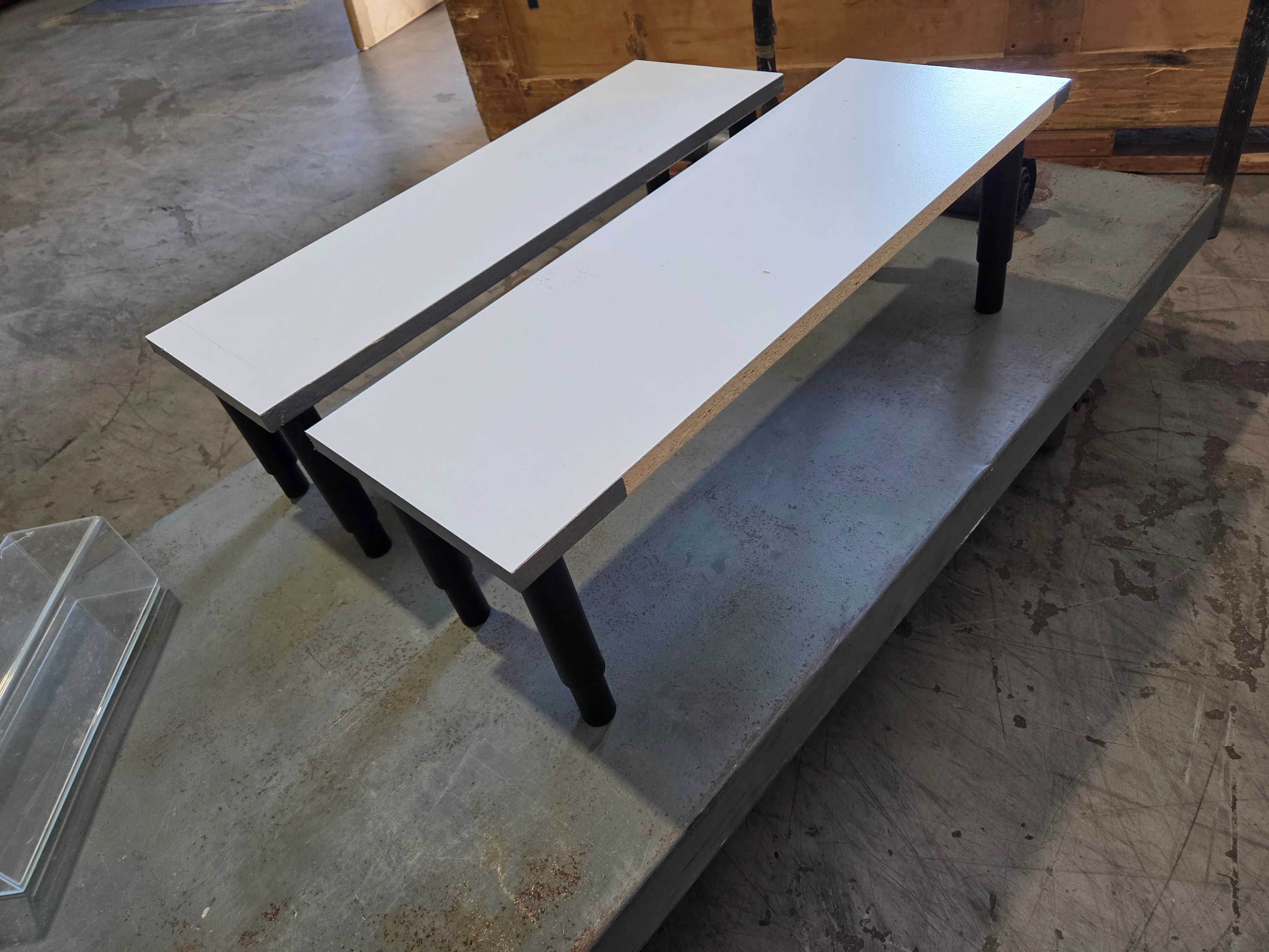 Table top tables. Think risers. White display tables. Approx 10 in tall by 30x10 inch on top. short small coffee table... Perfect for displays such as trade shows , special events, wedding dessert tables parties etc 500 btz ea 2 available gently used. Adjustable legs I have 2 others that are gold edge and abit bigger if you'd prefer.