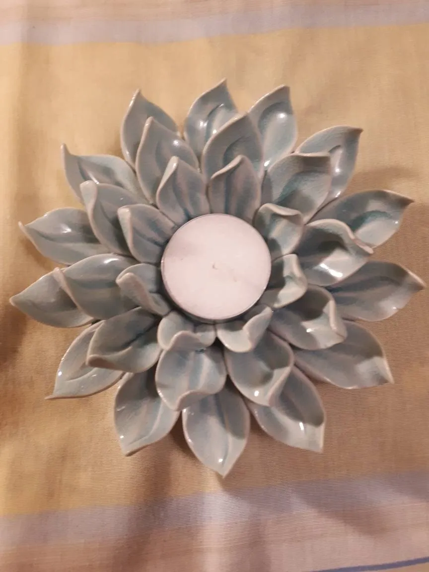Light blue flower shaped ceramic candle holder.