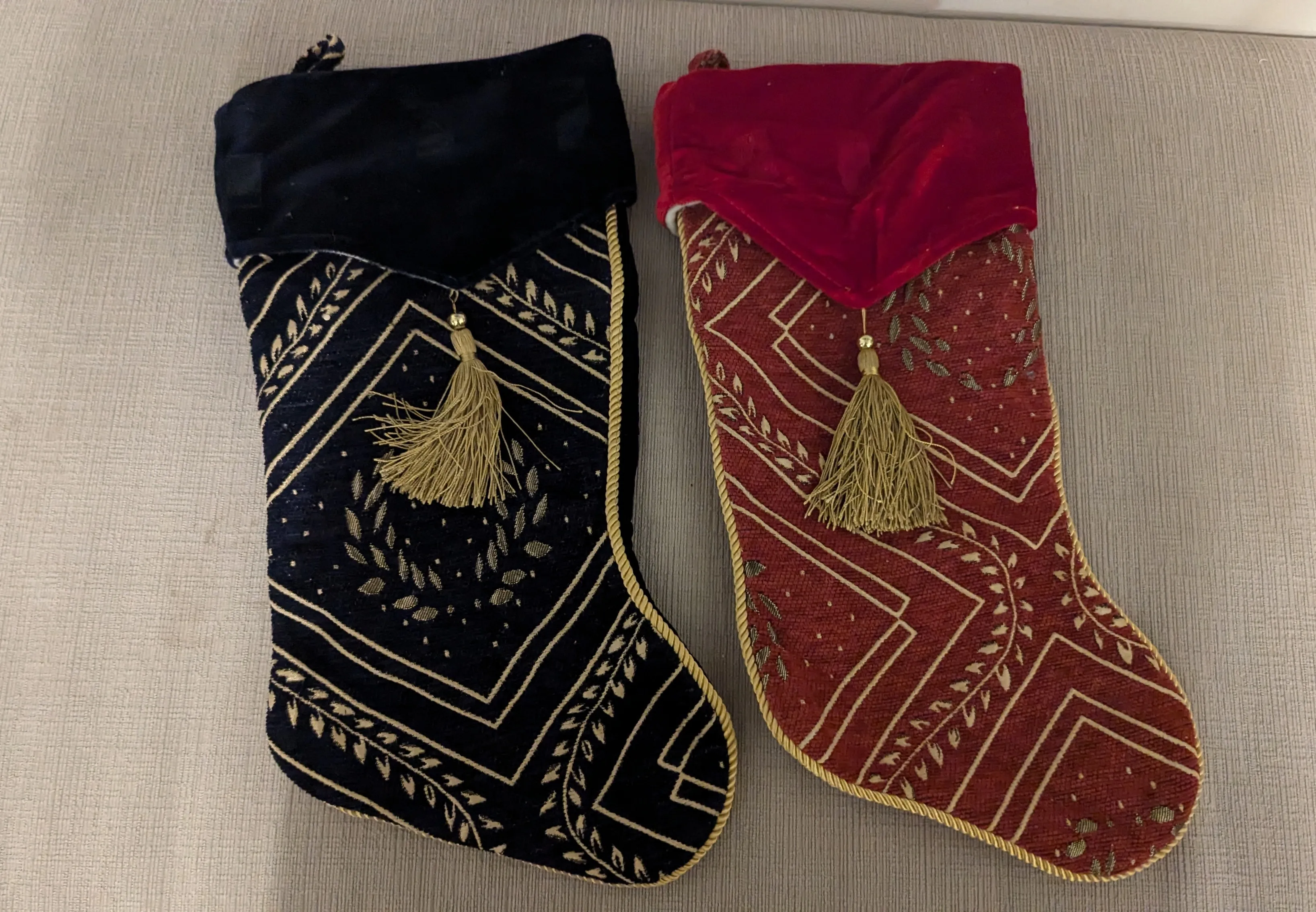 Set of two Christmas stockings, one red and one blue. Both feature a gold tassel and gold trim. They are in good condition.