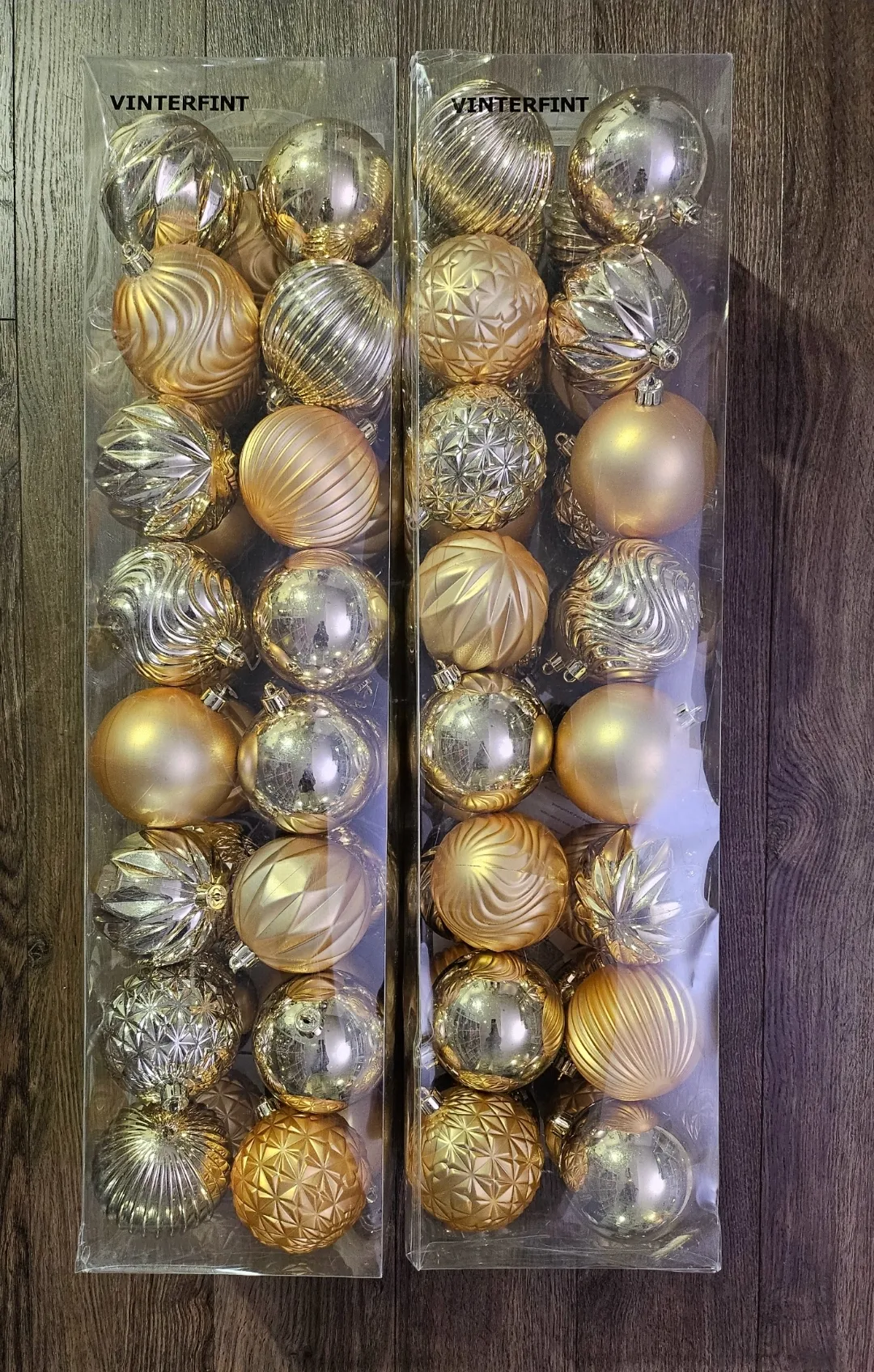 2 large boxes of plastic Christmas tree ornaments from Ikea. Lightweight, kid and pet friendly (my hand to show the size)