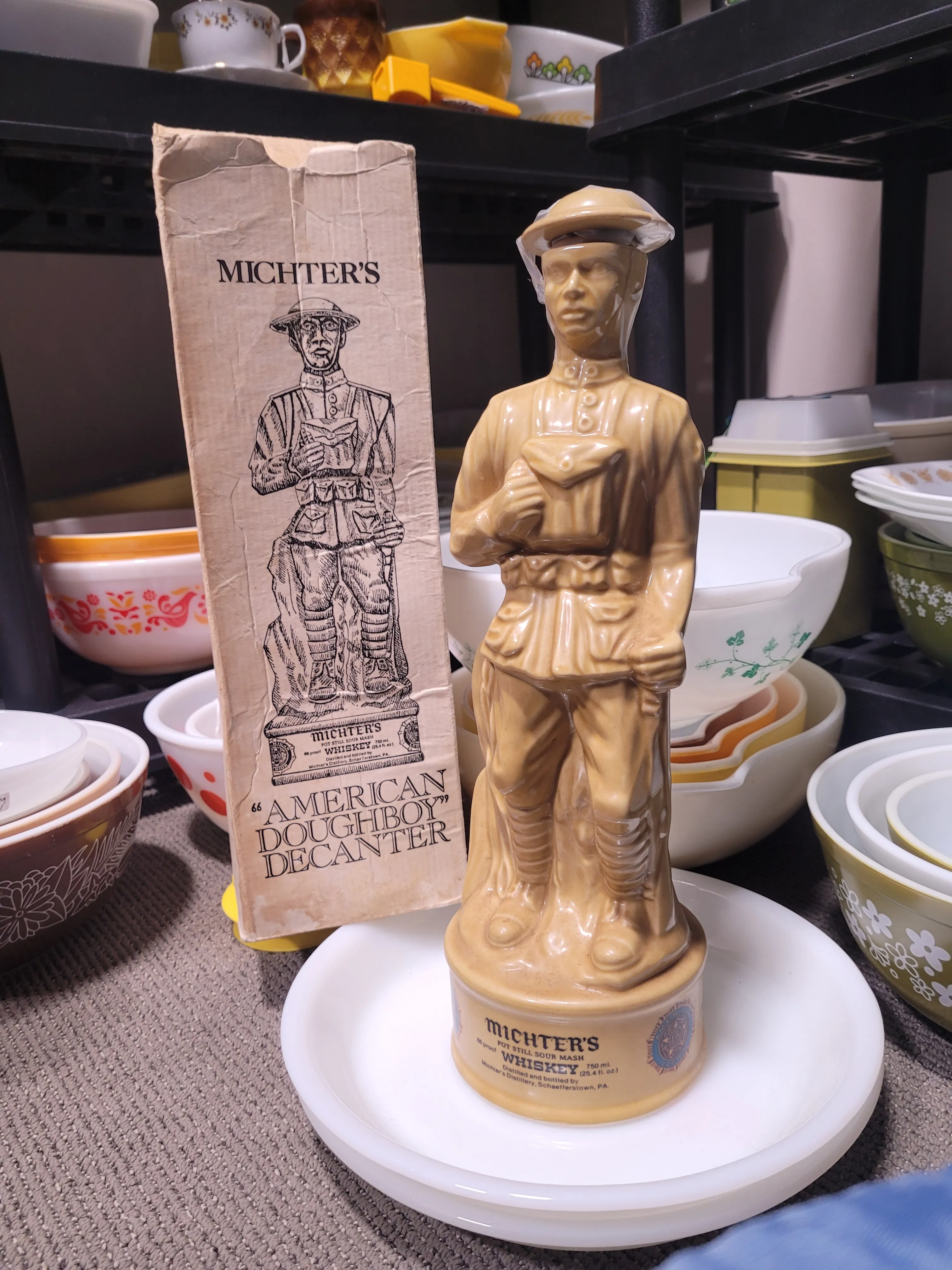 Vintage Michter's whiskey decanter. Doughboy soldier figurine. Original box included. Collectible item. Preference is to quick pickup at 391 attwell drive during monday to friday 830am to 430pm by appointment. Would take btz if you can pickup