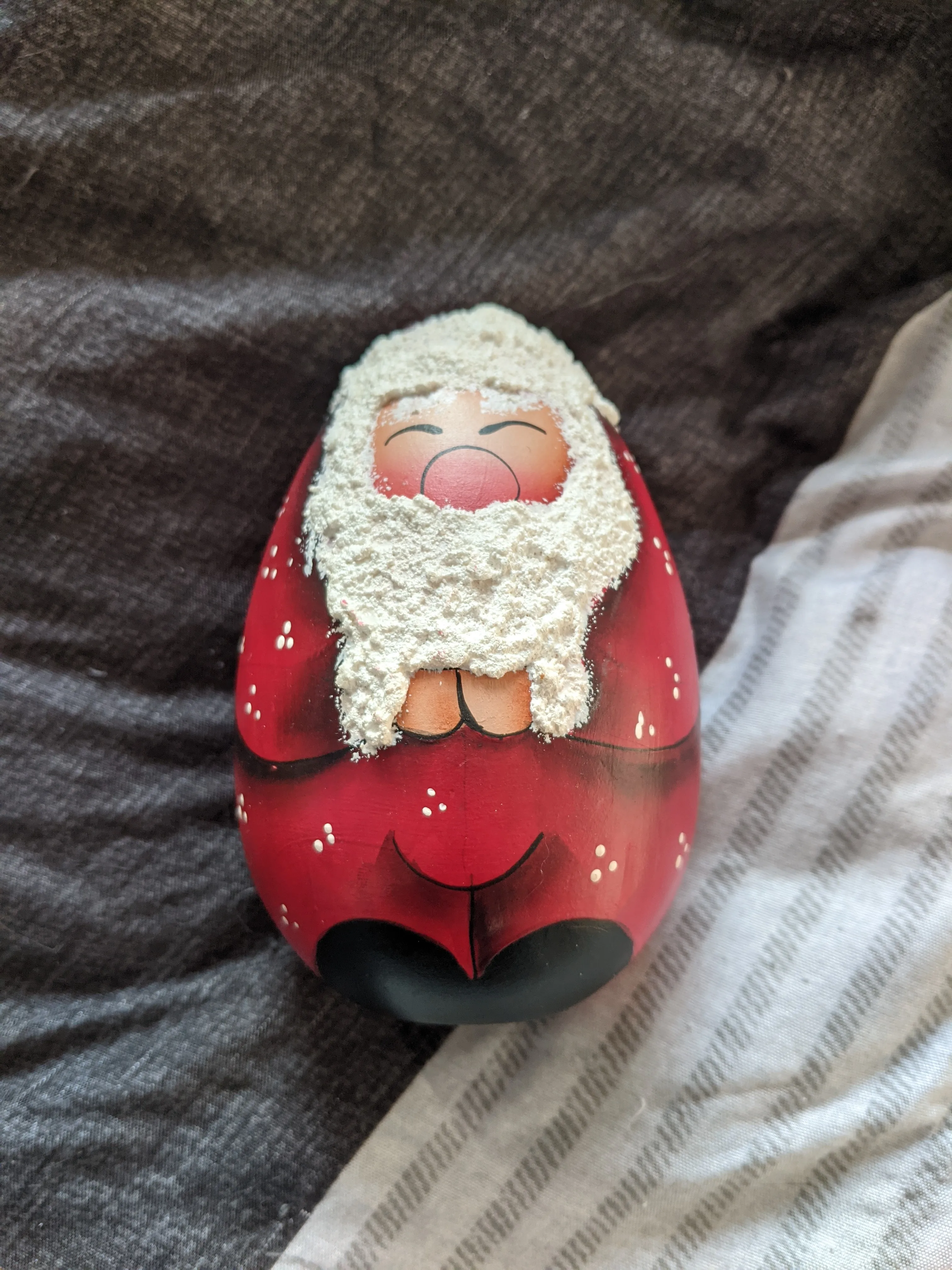 I believe it's wooden, handmade by an artist. About 4"/10cm tall. Did not come in any packaging. If wanted in time for Christmas, must be able to meet in downtown core or pick up at King/Niagara by Friday evening.