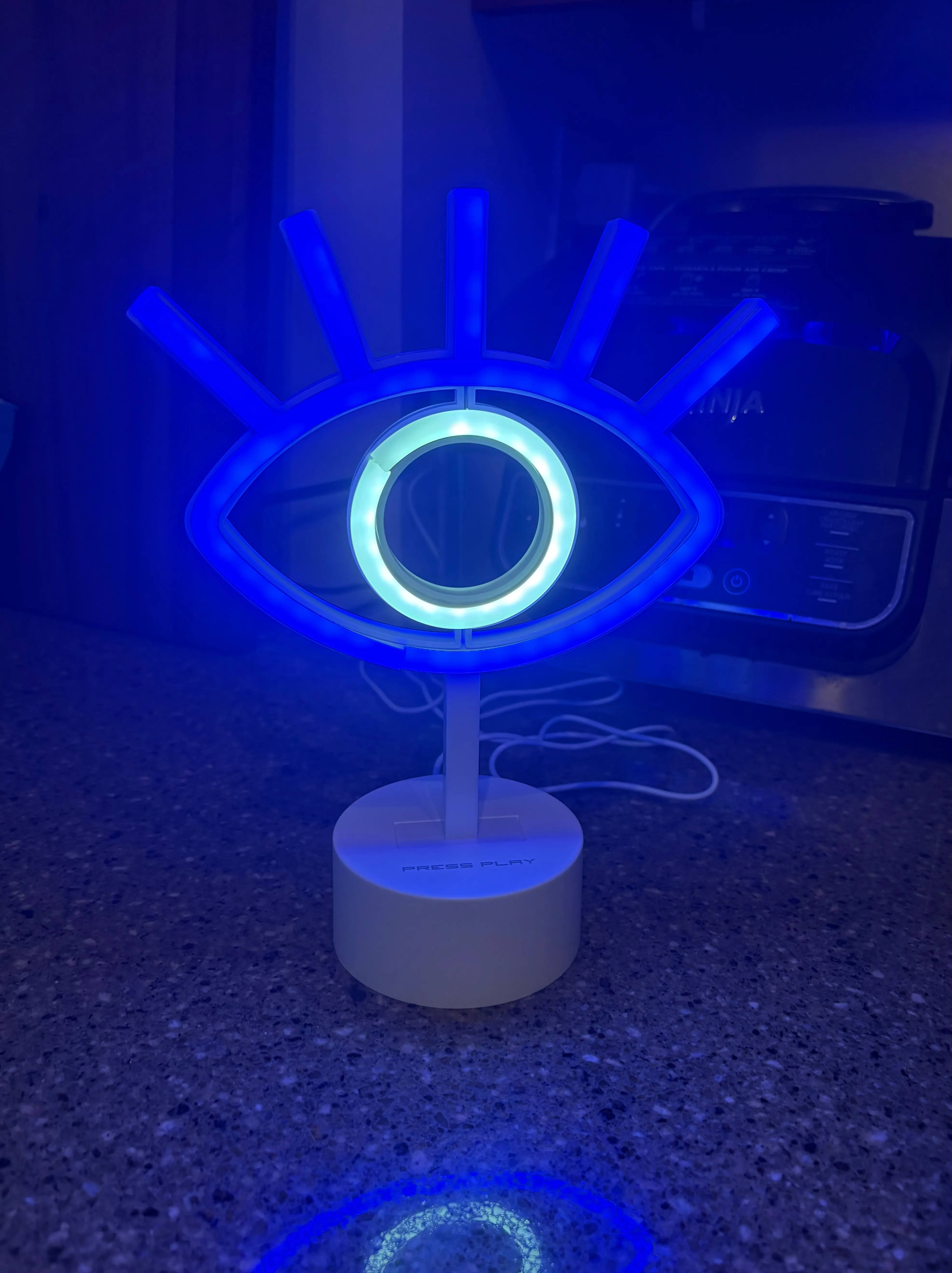 Modern eye-shaped LED table lamp that adds a unique, sculptural touch to any space. Gives off a soft ambient glow and works perfectly on desks, shelves, nightstands, or side tables.