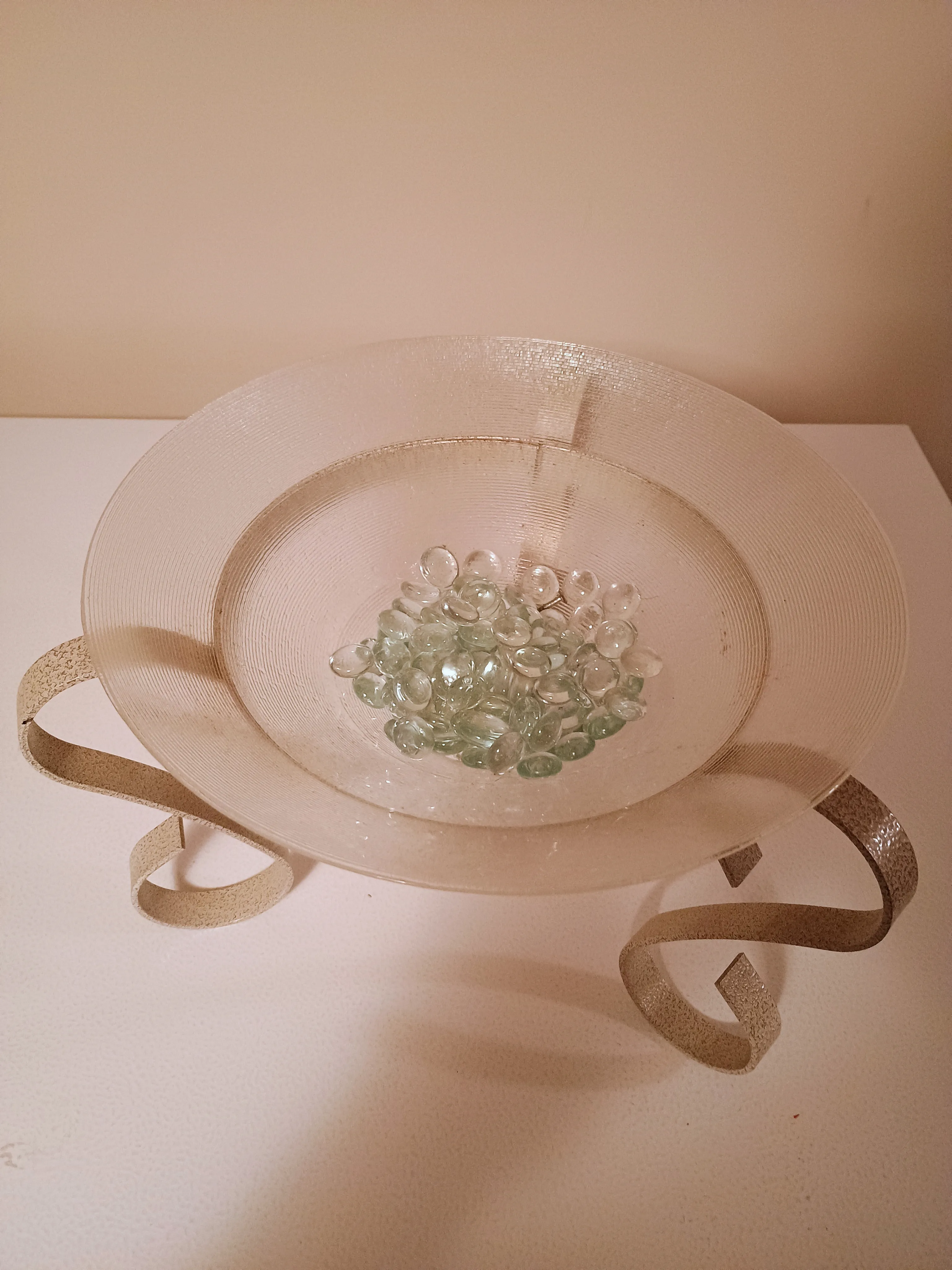 Glass bowl with a decorative metal stand. It's in good condition and would make a lovely addition to any room. Perfect for holding decorative items or as a centrepiece!