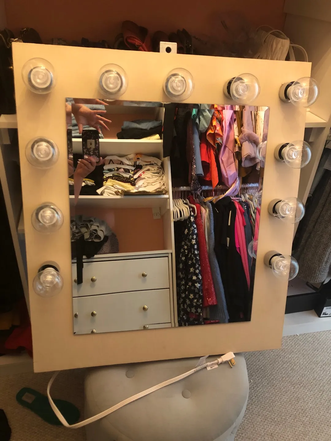 This was made and given to me by a friend but I can’t find the room for it. It’s perfectly functional. It’s about 32 inches tall by 30 inches long #vanity #beauty #decor #makeup #lights