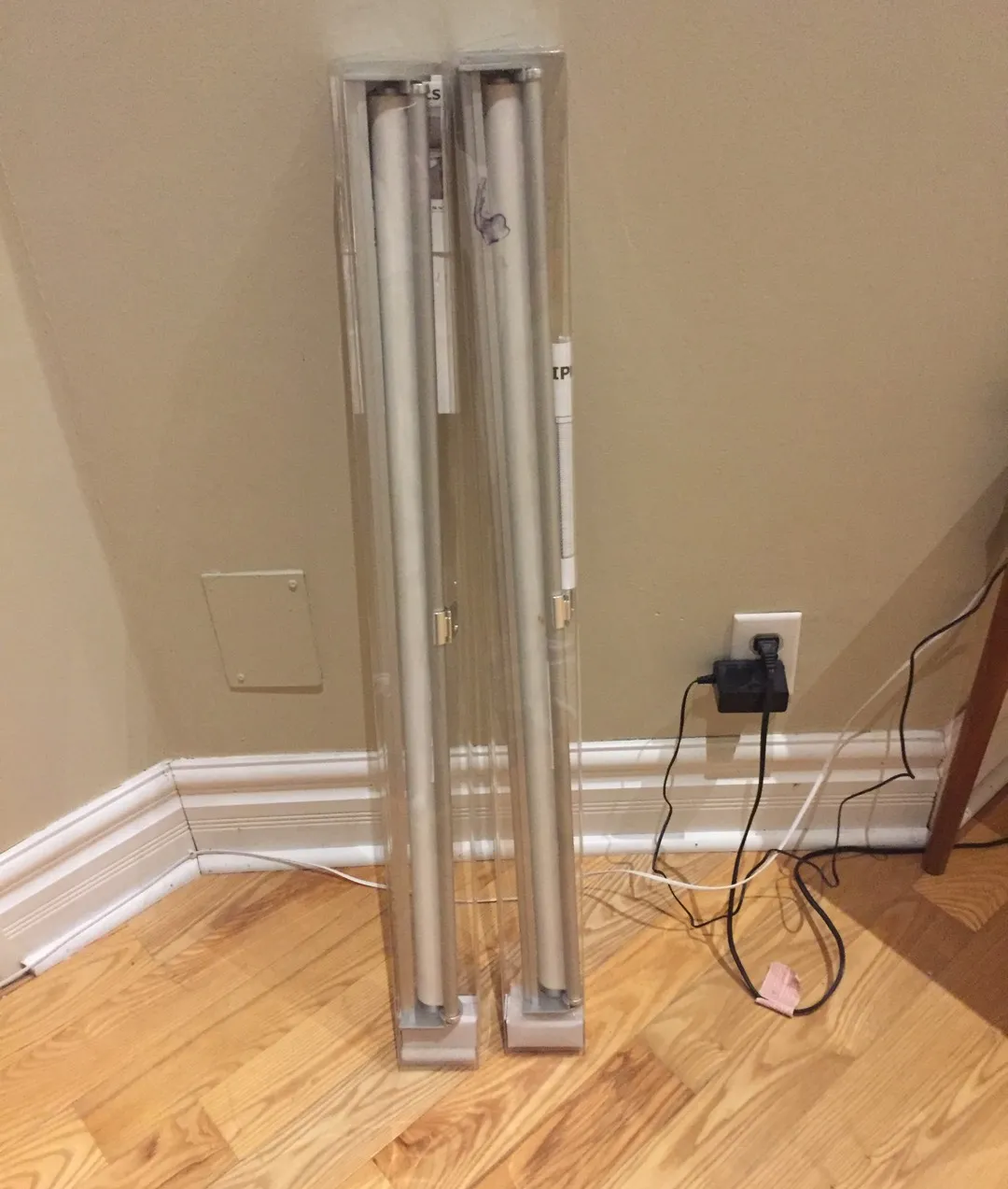 White and sheer to let light through. 34 inches wide, 76 inches long. Used briefly, but switched out with opaque blinds