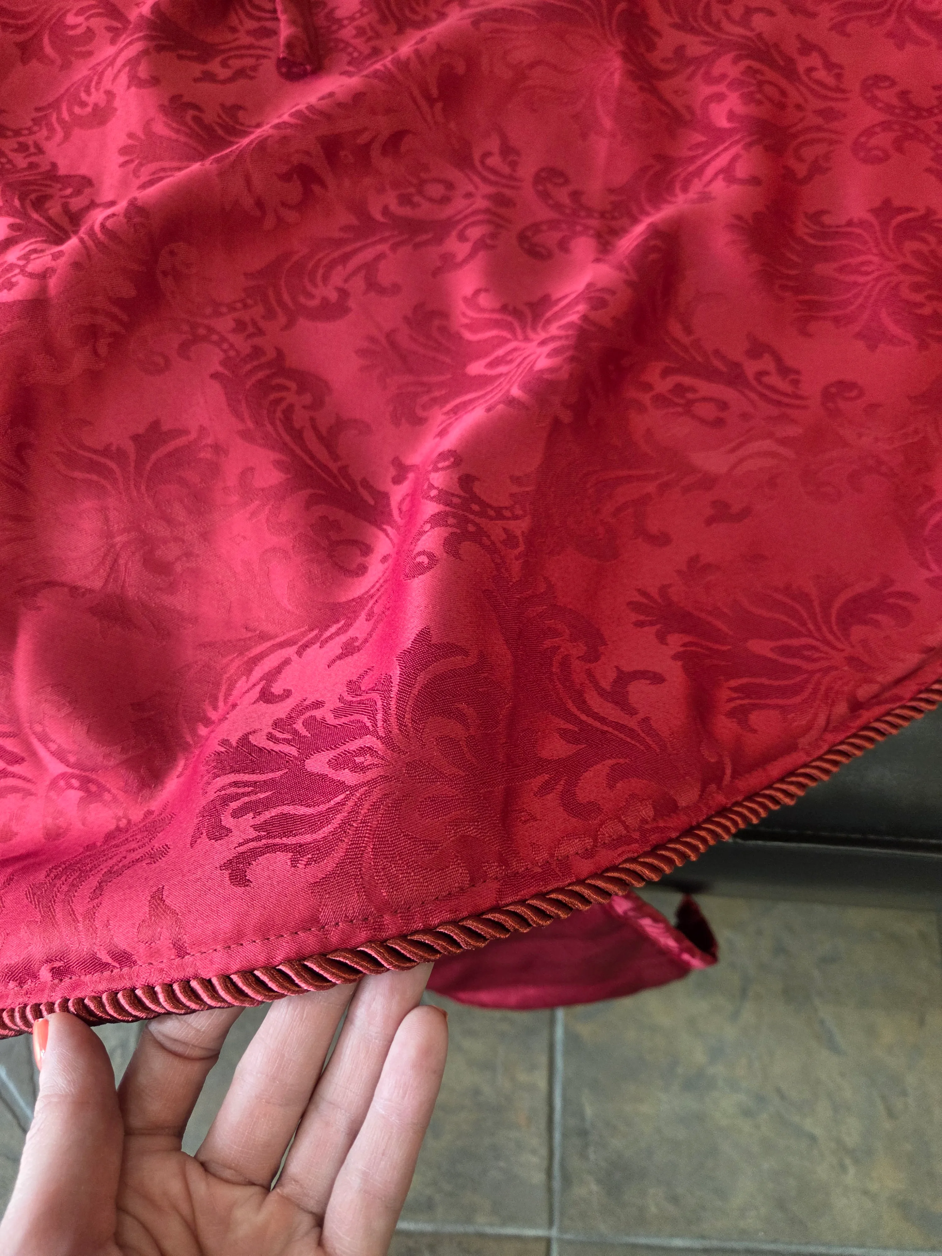 Vintage well made previously loved red Christmas tree skirt with stiff rope trim edge. Good quality material. Has tie up closures , one tie up has a stain on it but literally you tie it up at the back of the tree so it dosnt affect the function or look of this beauty. Pick up at 500 Carlingview drive Toronto during monday to friday 830am to 430pm by appointment.