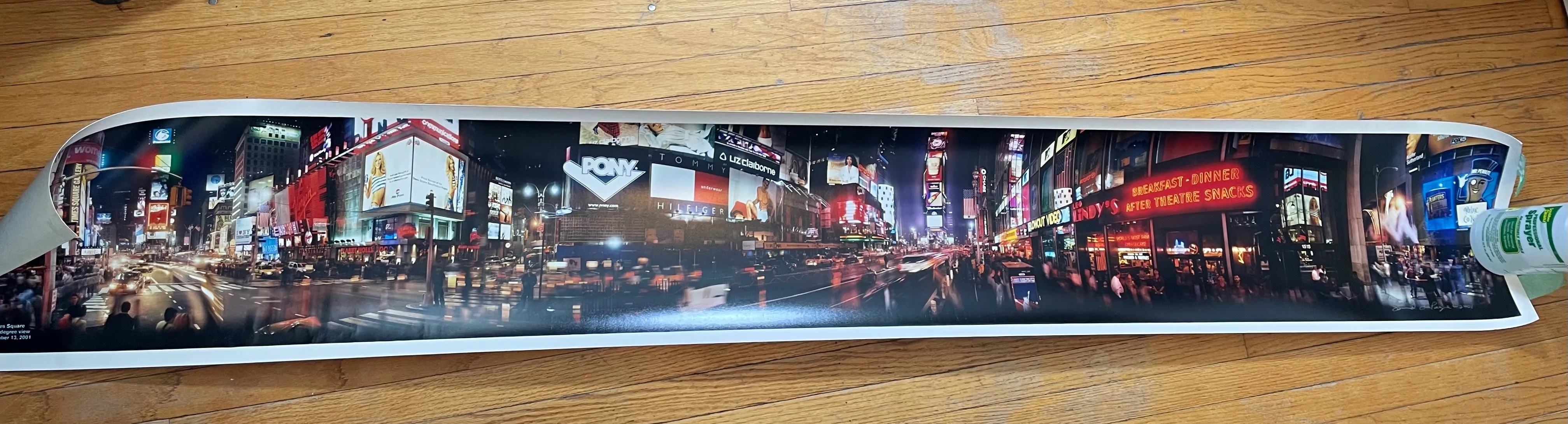 Very long (like 5-6 feet?) 360 degree panorama of Times Square in NYC, taken in 2001 and signed by the photographer. This is an actual printed photo so was somewhat expensive back in the day. Full of all kinds of nostalgia including a Brittany Spears Pepsi ad. You'd probably want to mount it or glue it to a solid backing or put in a frame, etc. Pretty neat piece but I don't have room for it.