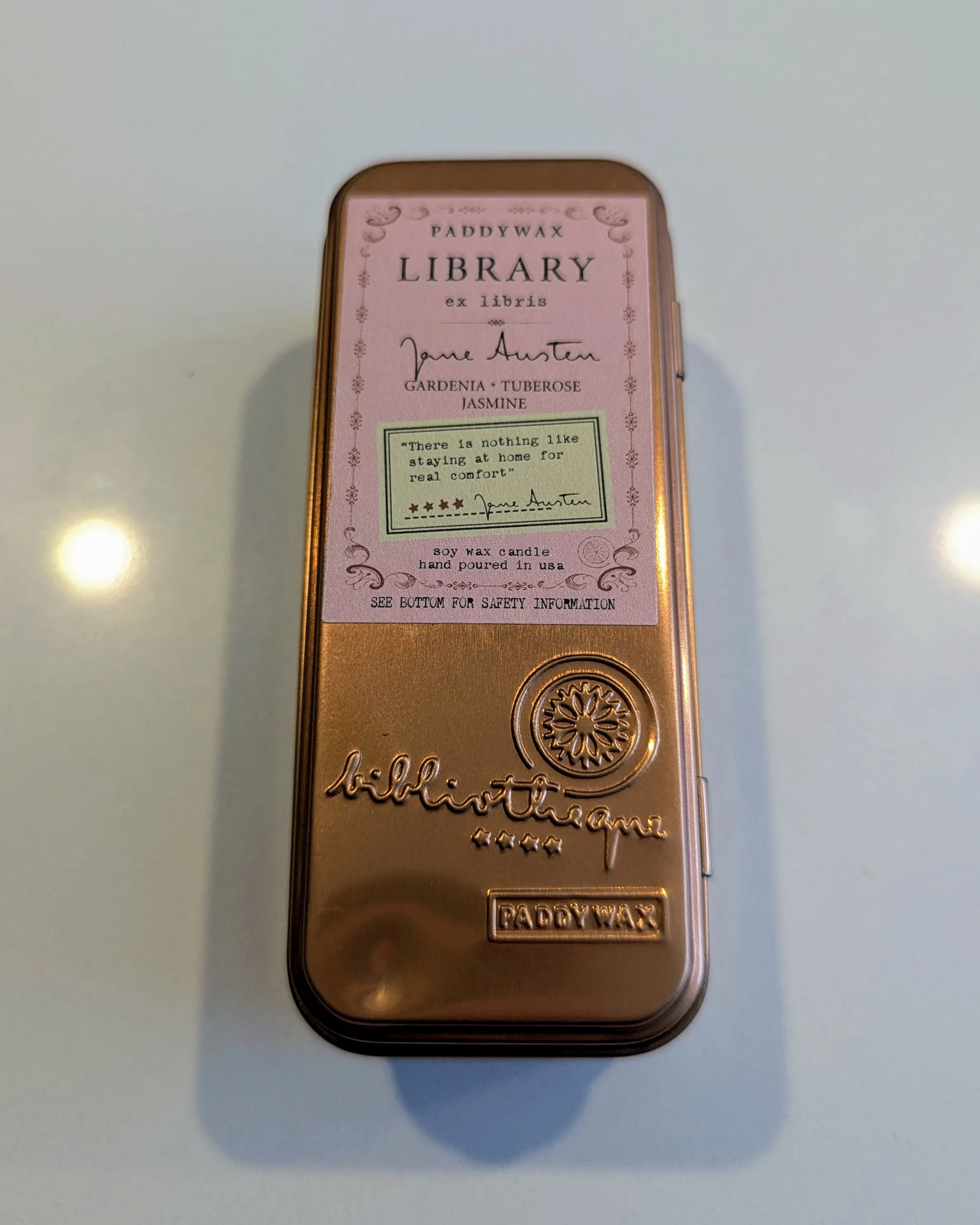 Rose gold metal tin candle. Soy candle, hand-poured in the USA. Paadywax Library collection, Jane Austen, Scent: Gardenia & Jasmine. Two wicks. New but small dent in metal bottom left ( see pictures