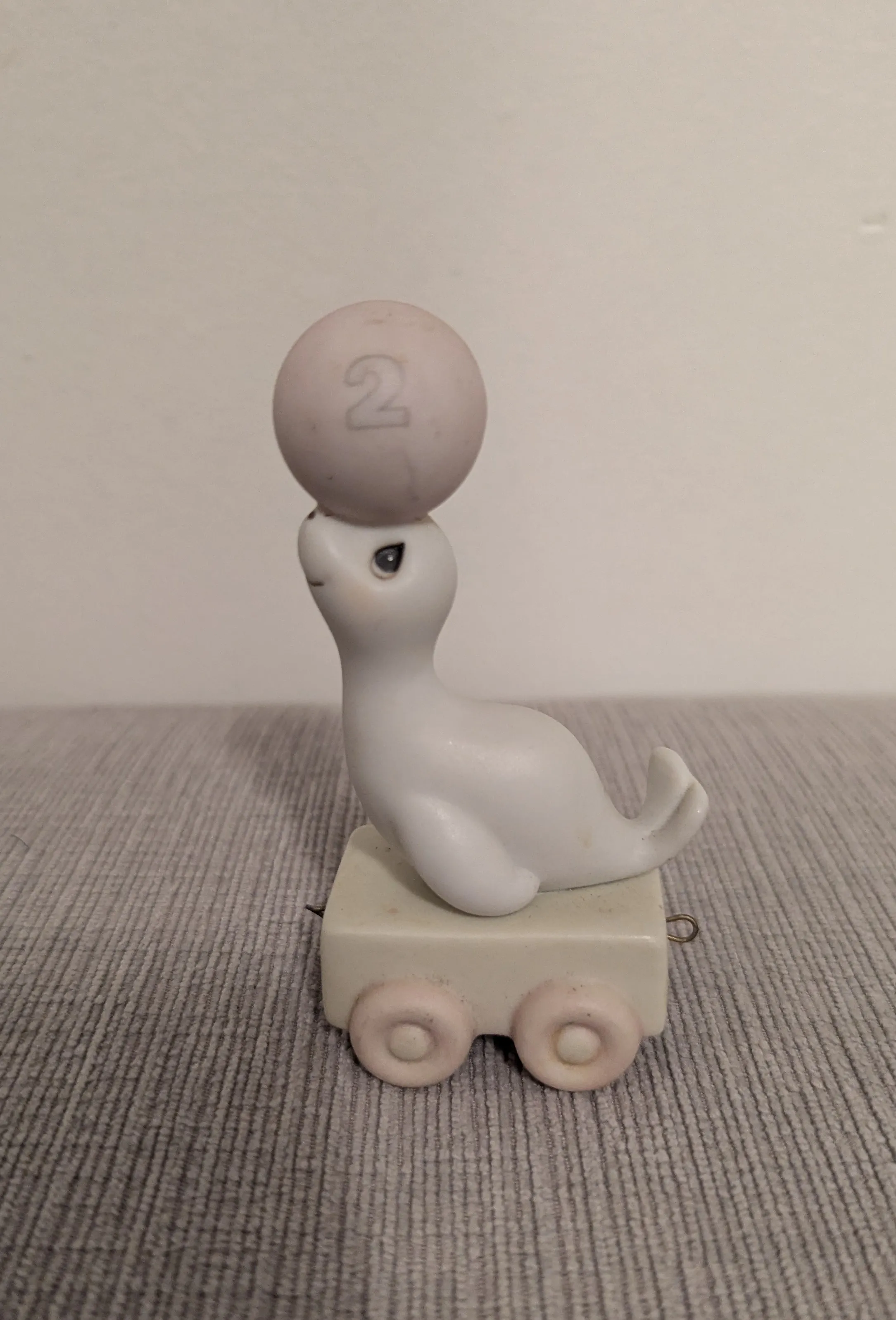 Precious Moments figurine of a seal balancing a ball on its nose. The seal is on a small wagon with wheels