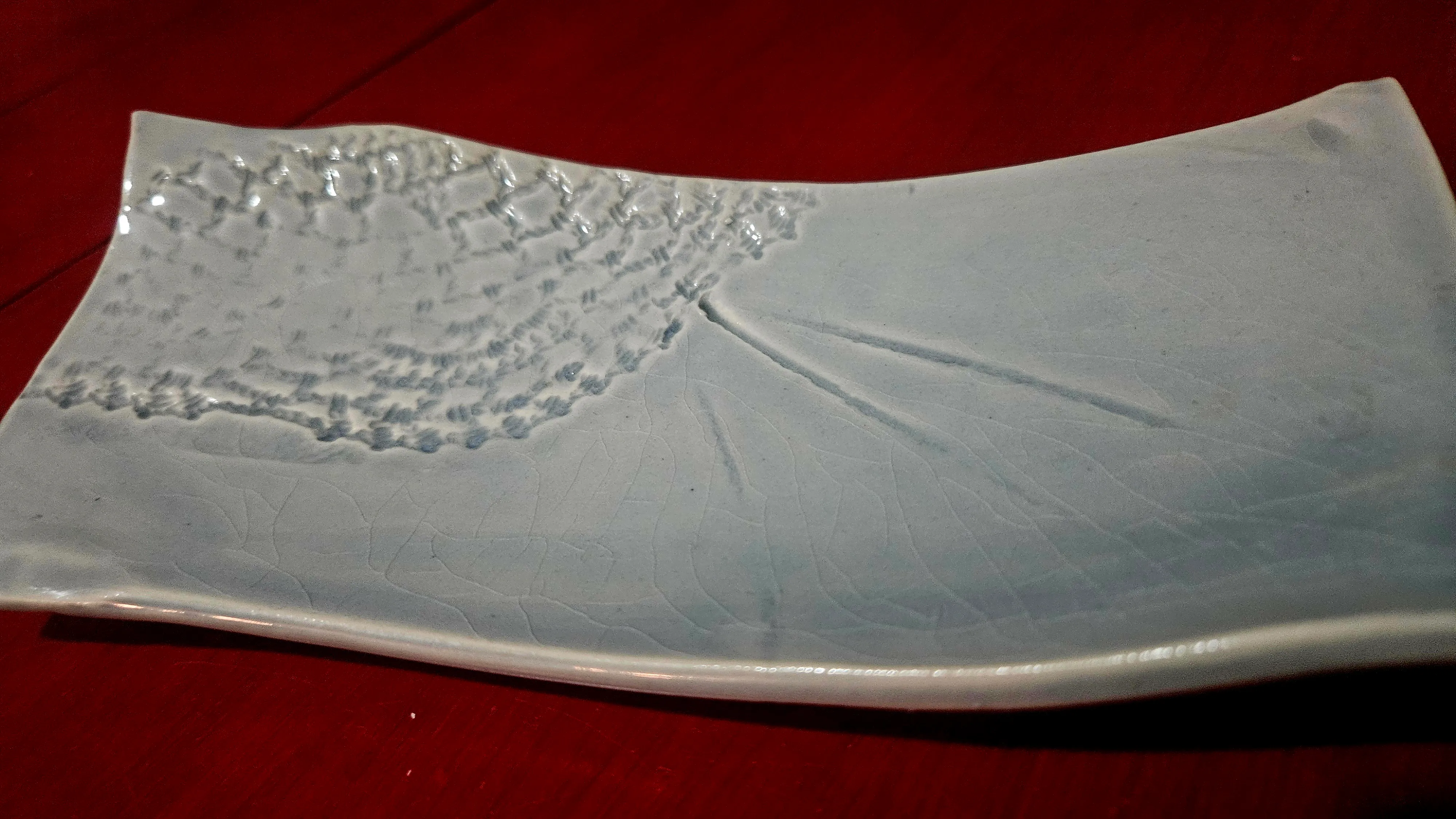 Small, light blue ceramic dish. Intricate textured design. Slightly wavy edges. Hand-made. Unique piece.