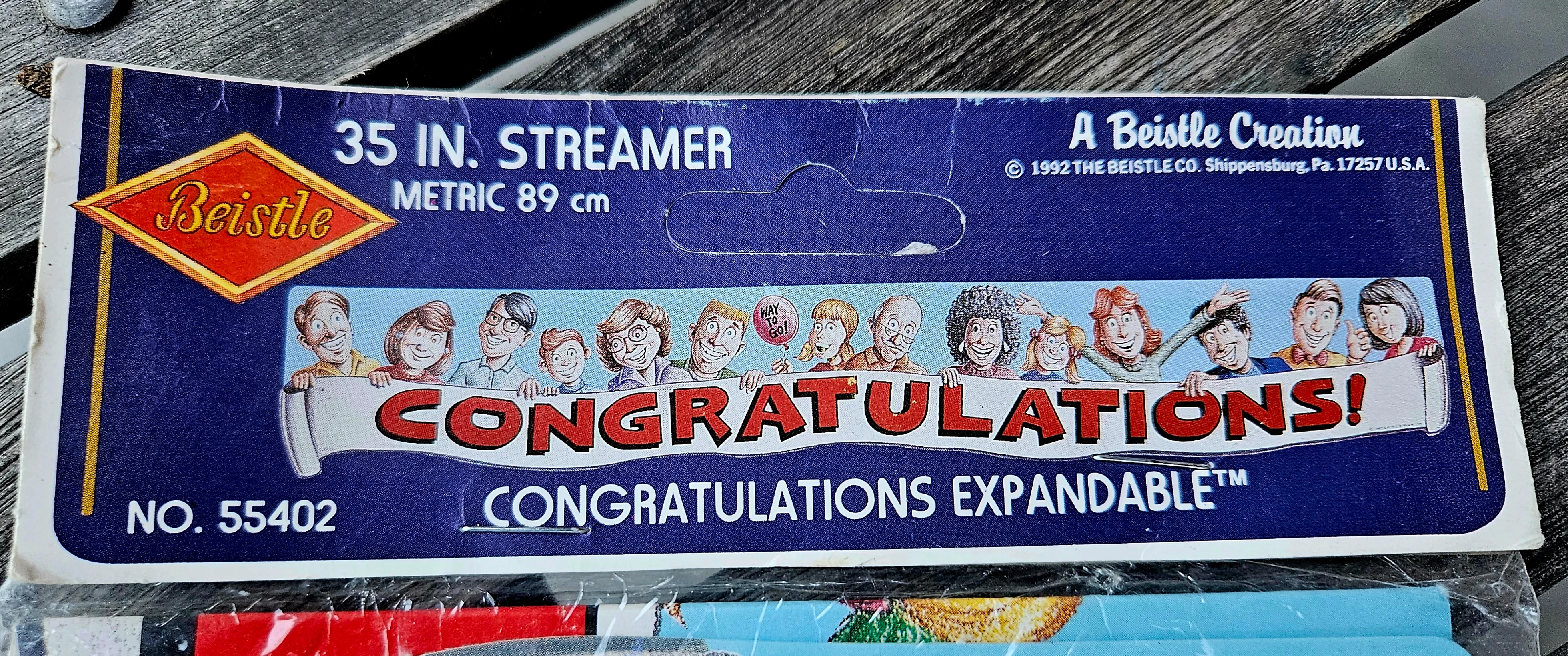 Vintage Beistle congratulations banner. Expandable streamer. Perfect for graduations or other celebrations. New, in original packaging.