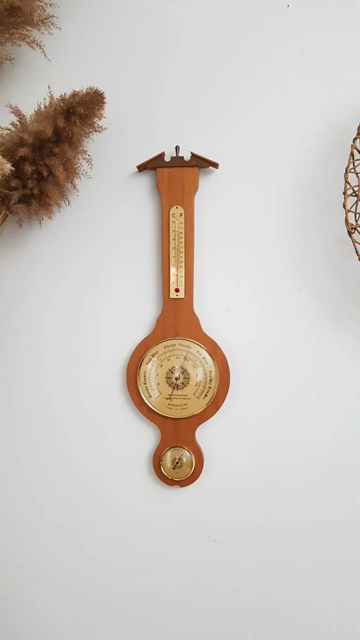 French made vintage analogy weather station in veneer wood with brass fixings.