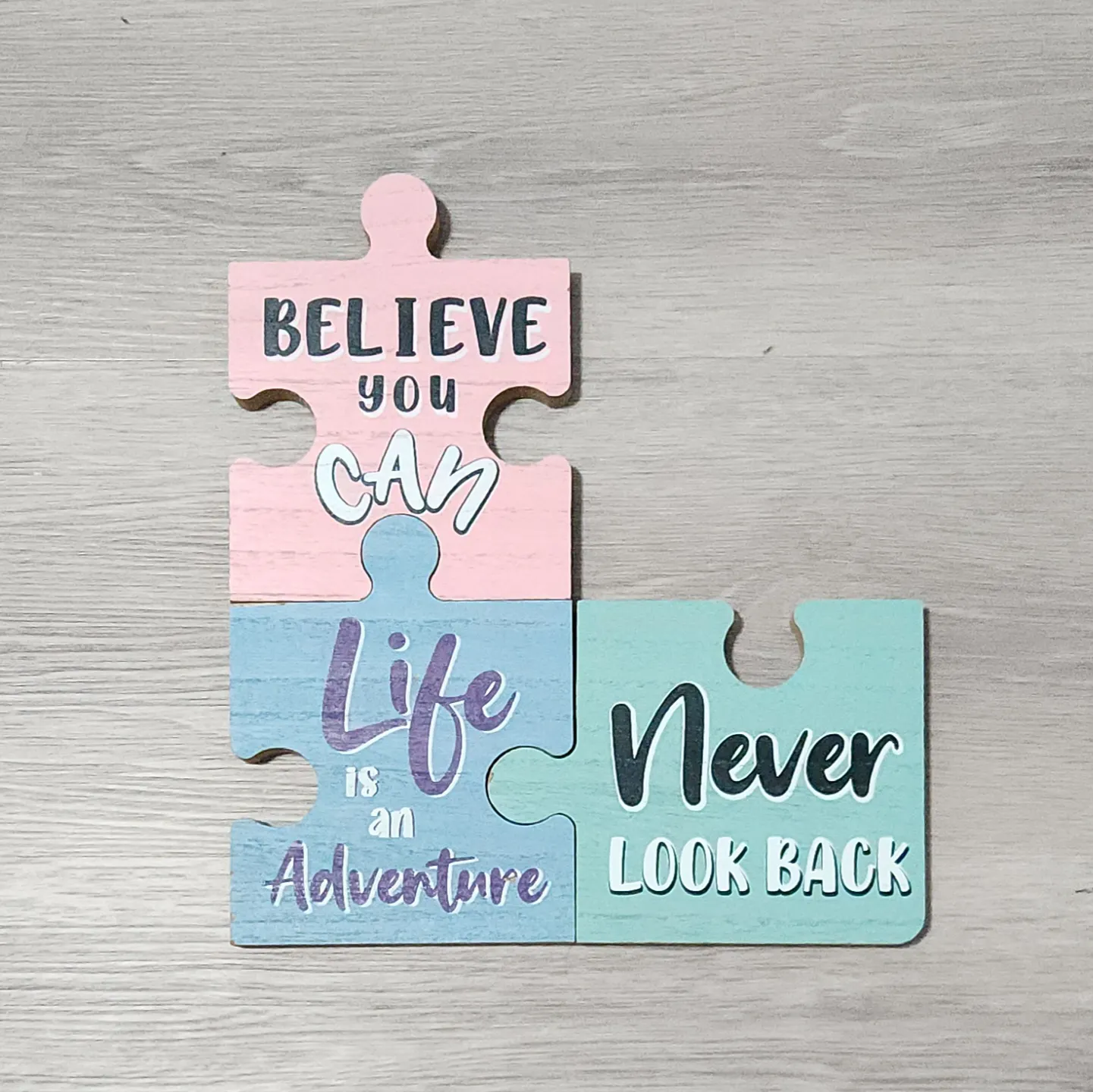 3 puzzle pieces wooden decor that are pastel with sayings on them. They also interlock and you can change the ones them around.