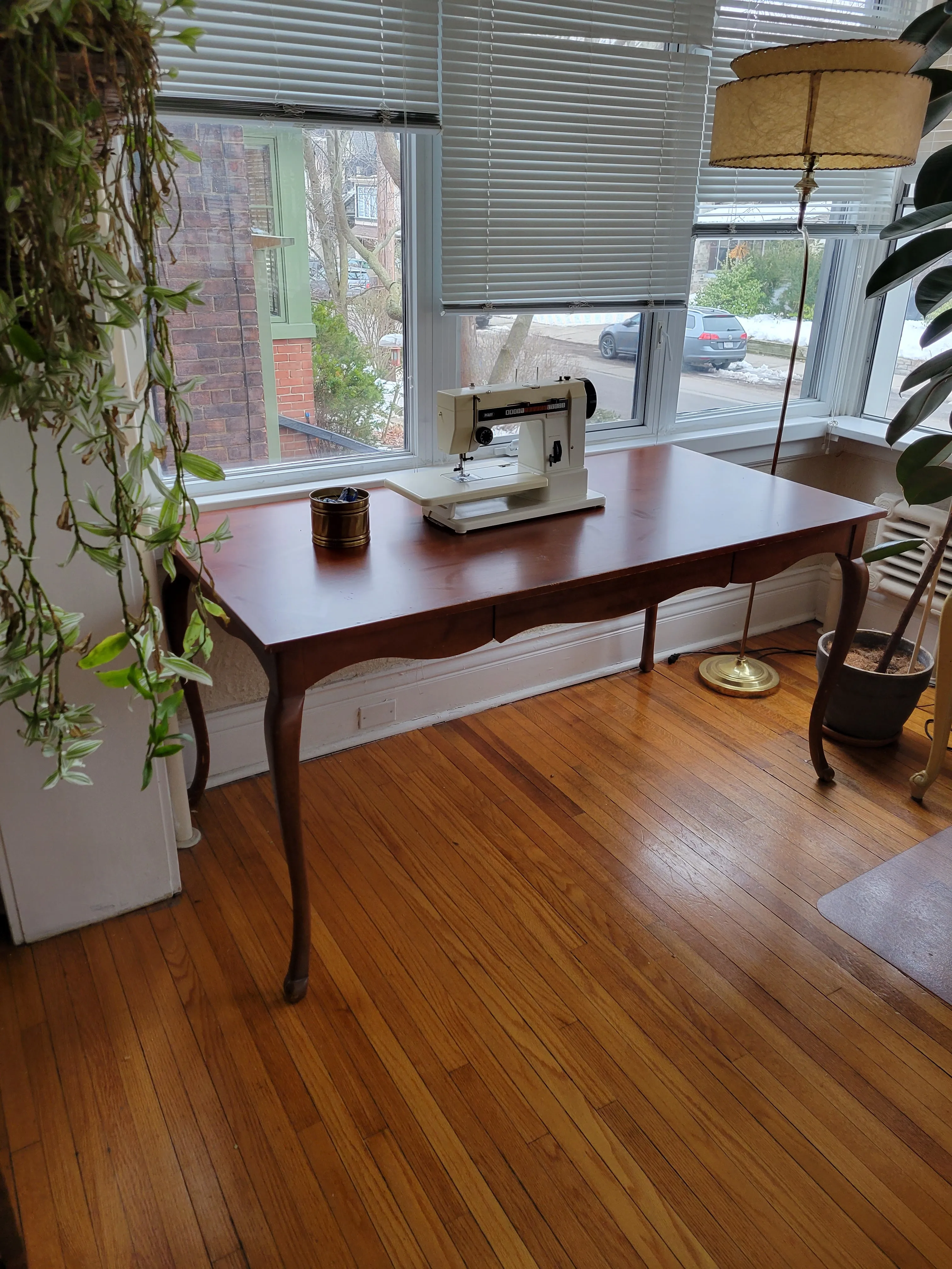 Table was made by fleet wood fine furniture inc .100% made in Canada. Drawer works great - nice and smooth. Legs are nice Some wear and tear in the top of the table, but nothing heinous. Legs come off for easier transportation. Bought used recently, just too big for my space.