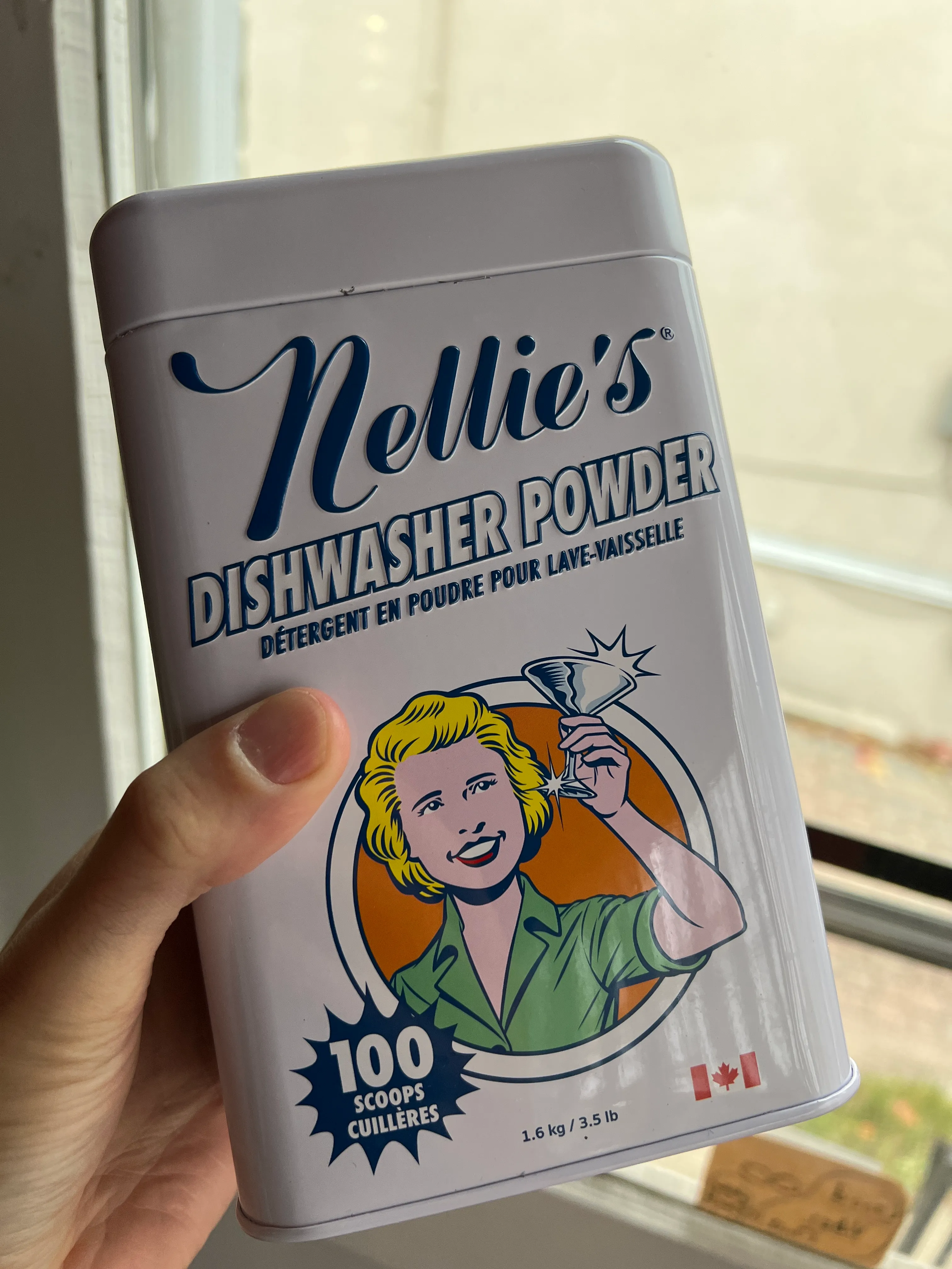 Probably 90% full tin of Canadian-made, low-toxicity dishwasher detergent powder.
