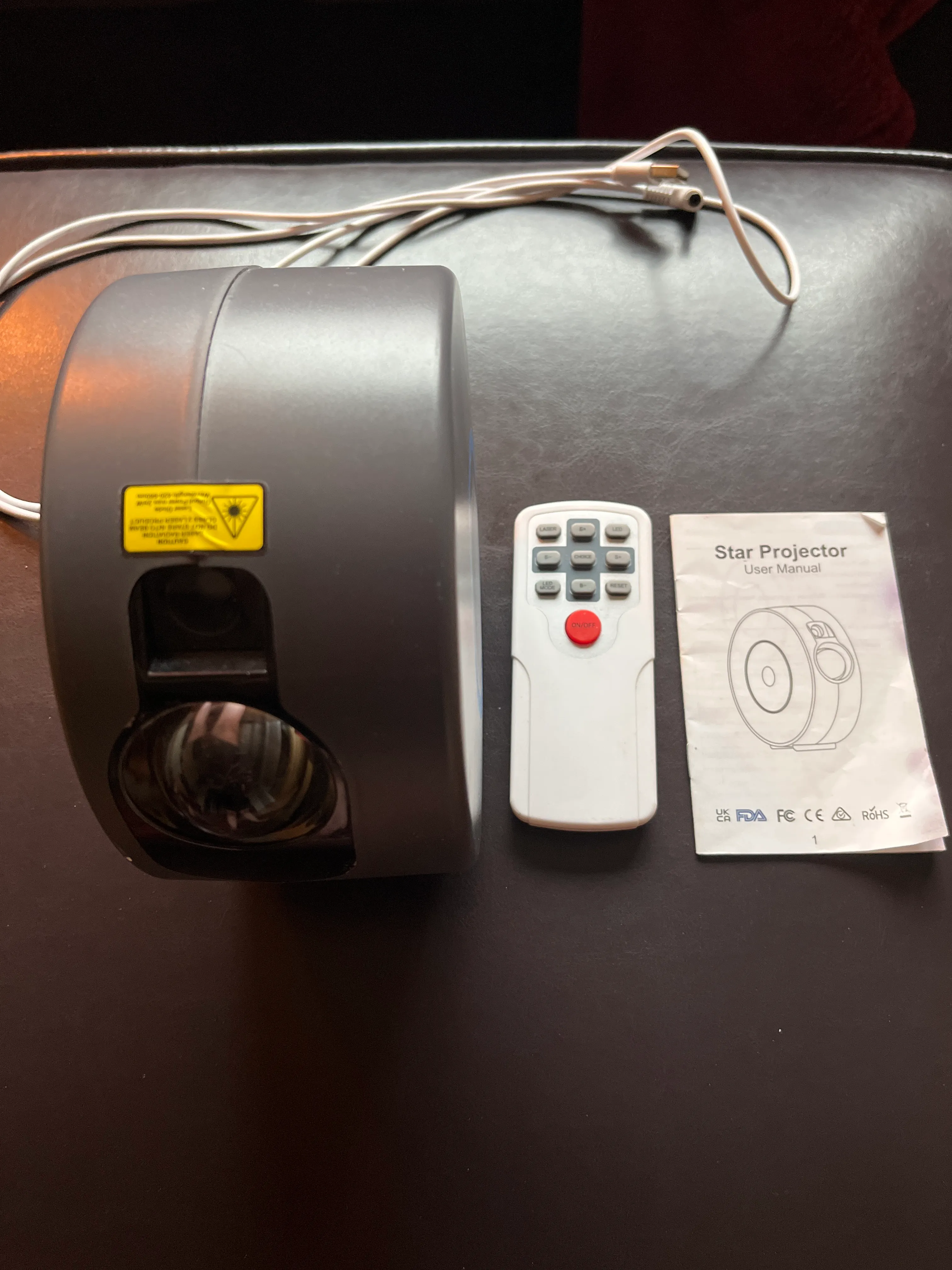 LED Nebula Galaxy Star Projector with remote control. Includes instruction manual and USB power cord.