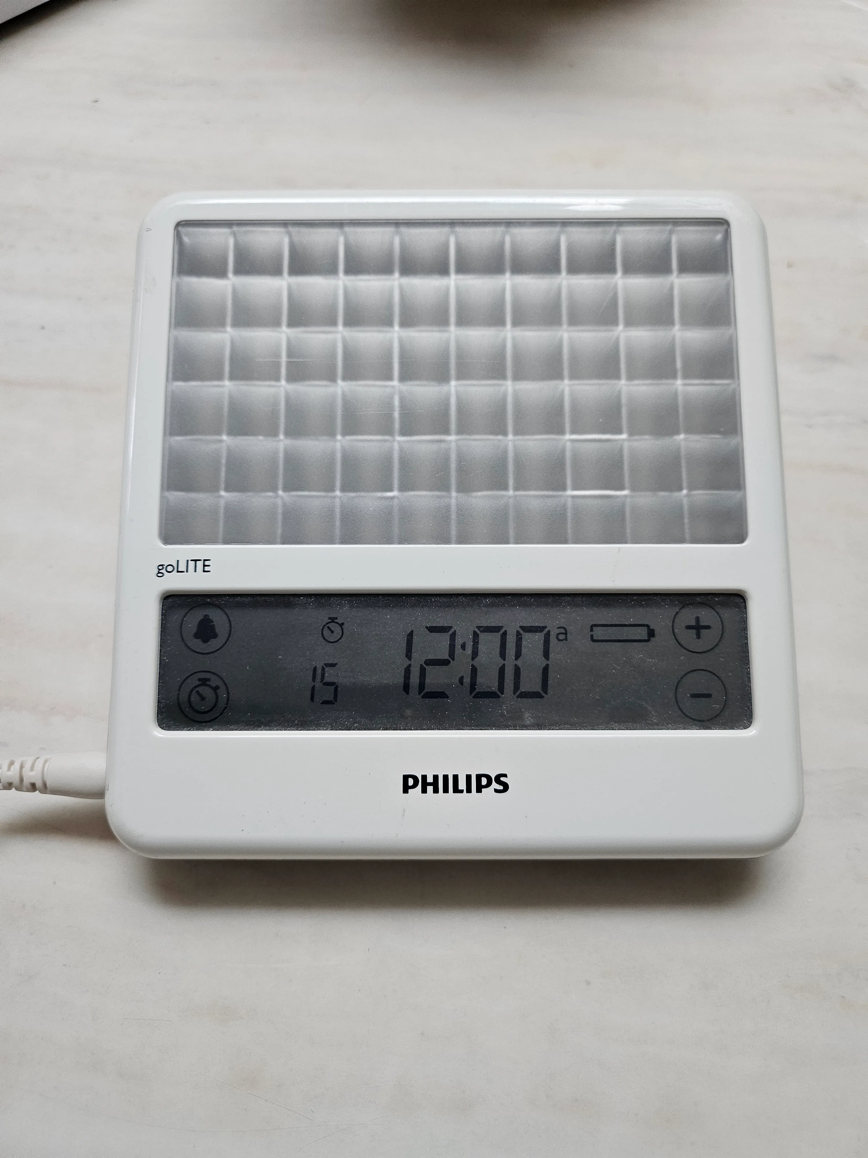 Got this a while back when I was struggling with the gloom of winter. Sitting beside this light is supposed to mimic natural daylight and help with mood and seasonal affective disorder (SAD). I used to put it on timer so I got more light on the morning.
