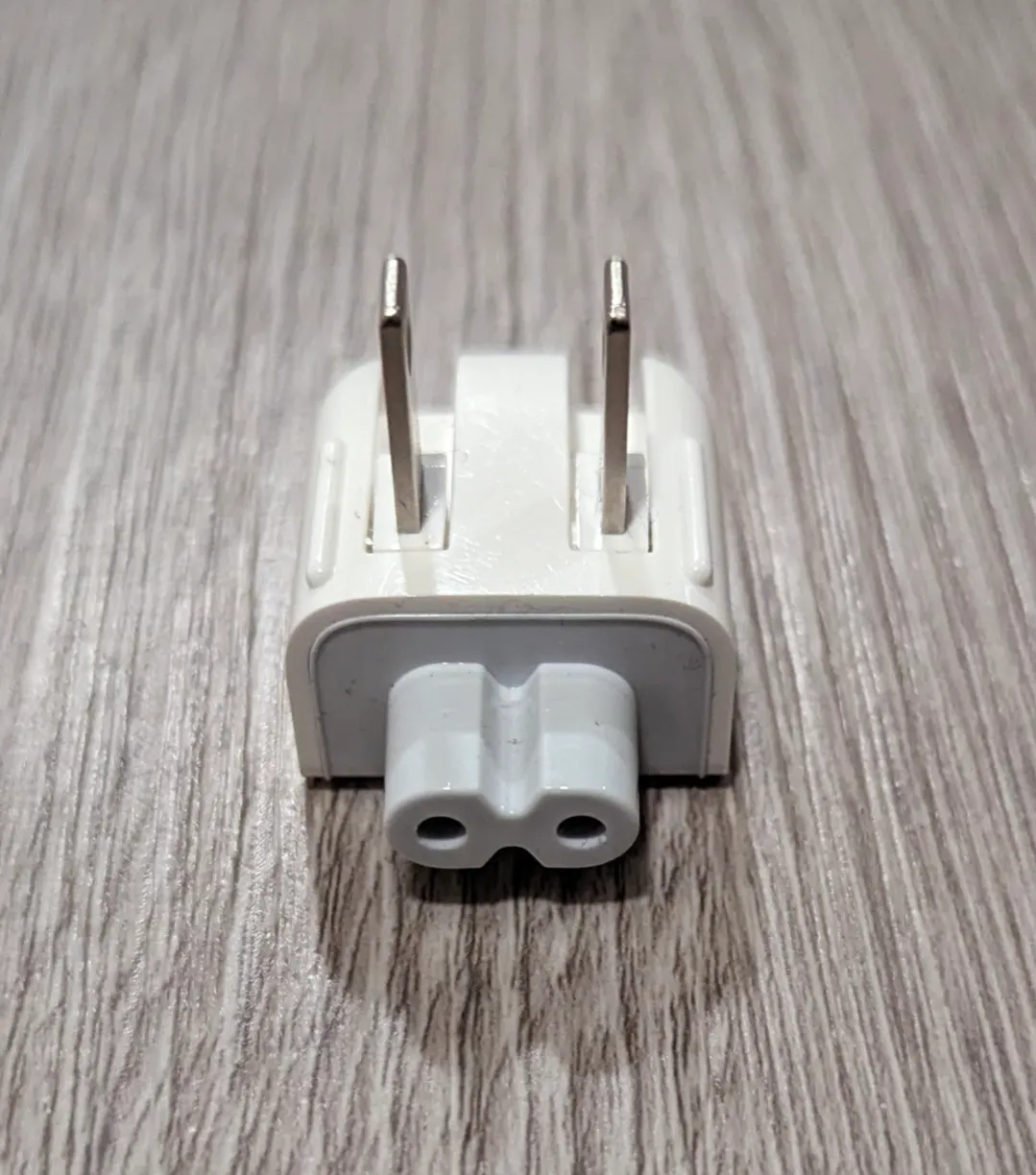 A white power adapter plug. It is compact and well-built. It's perfect for charging your devices while you relax at home.