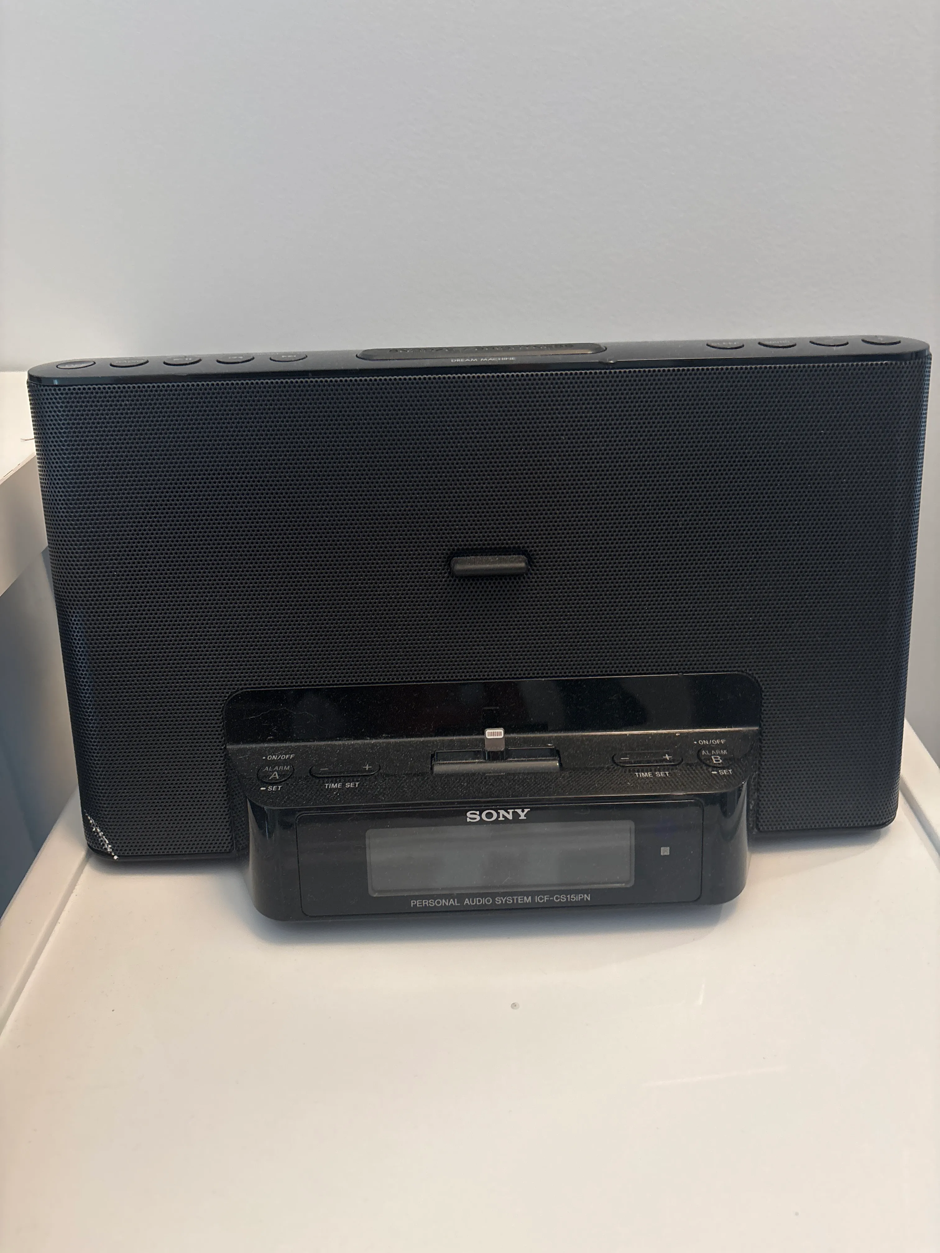 Plug in your ipod/iphone (with the lightning charger) or use as a stand alone radio or alarm clock. Plugs into the wall