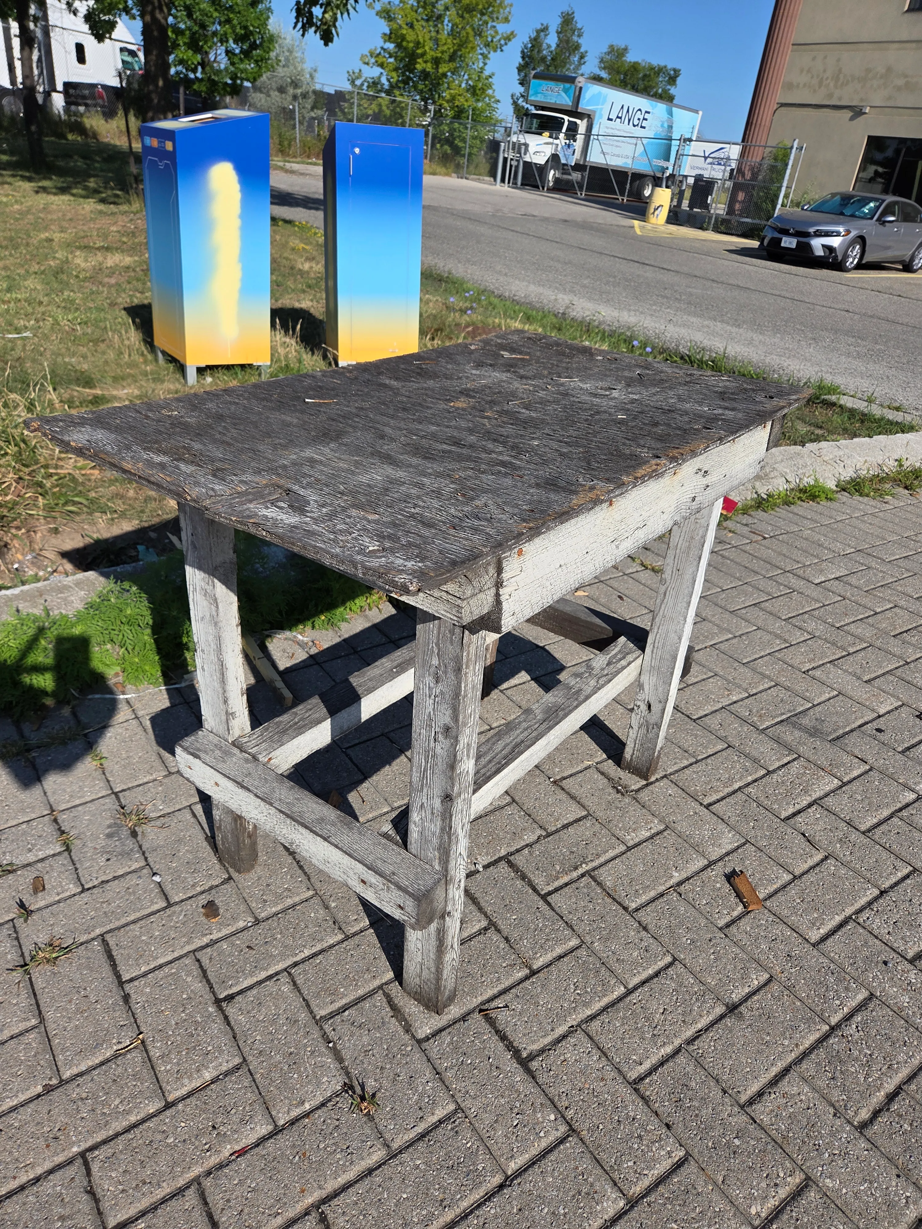 Good for a potting shed or shabby chic looking garden table. Not huge. No time to measure. used outdoors ready for a new home. Would fit in an suv with the seats down. Its on the curb now first can come first can get. Bring help to load! No holds. Come to 391 attwell drive! Etobicoke