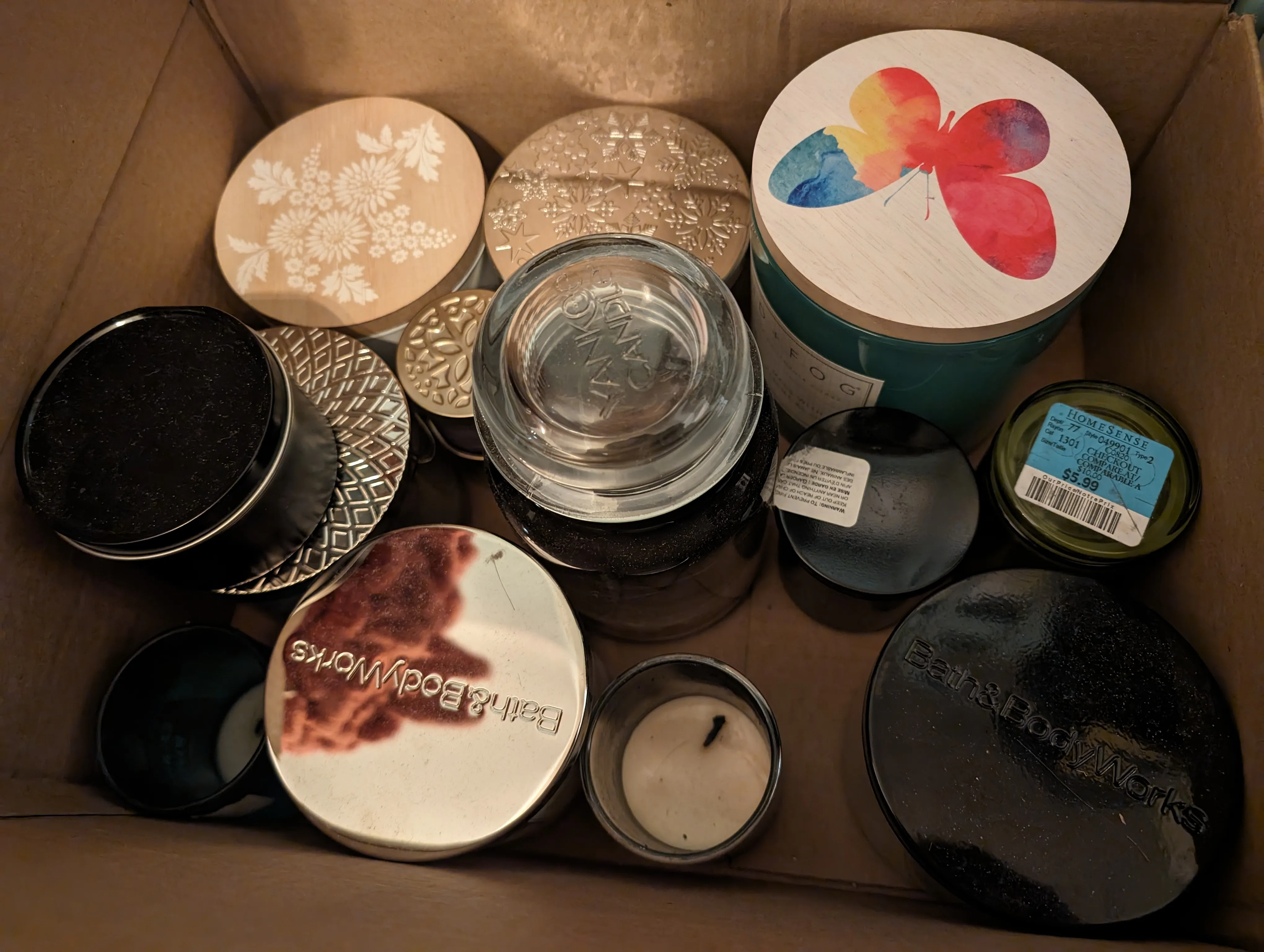 Collection of used candle jars. I have not cleared out the remaining wax, so you'll have to do that yourselves. Assorted sizes and materials of jars.