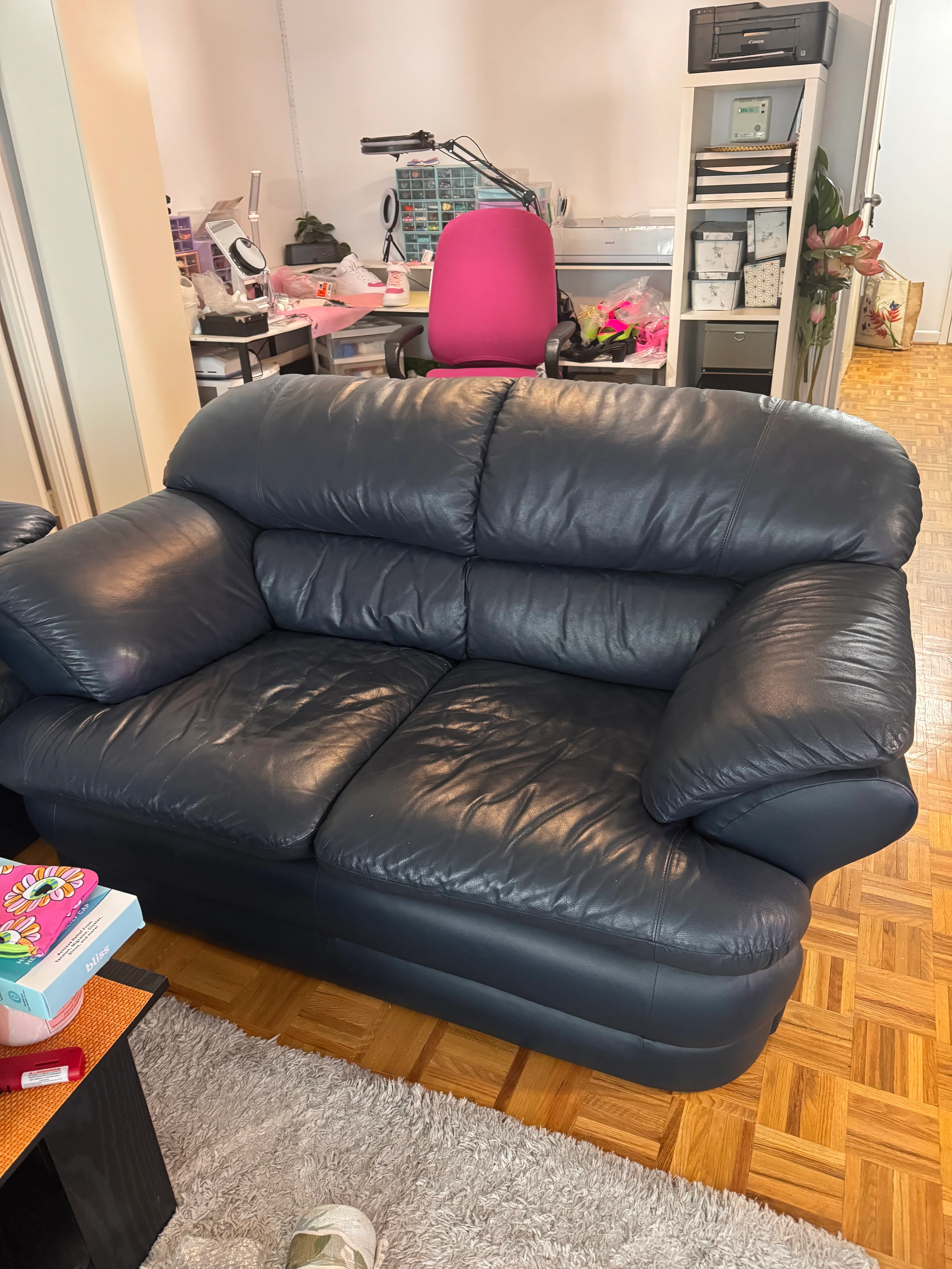 Very comfortable love seat. Genuine leather. No cushion damage. Small leak damage but it’s nothing you cant hide with a pillow. I’m looking for someone to do roughly 5-6hrs of cleaning in return.
