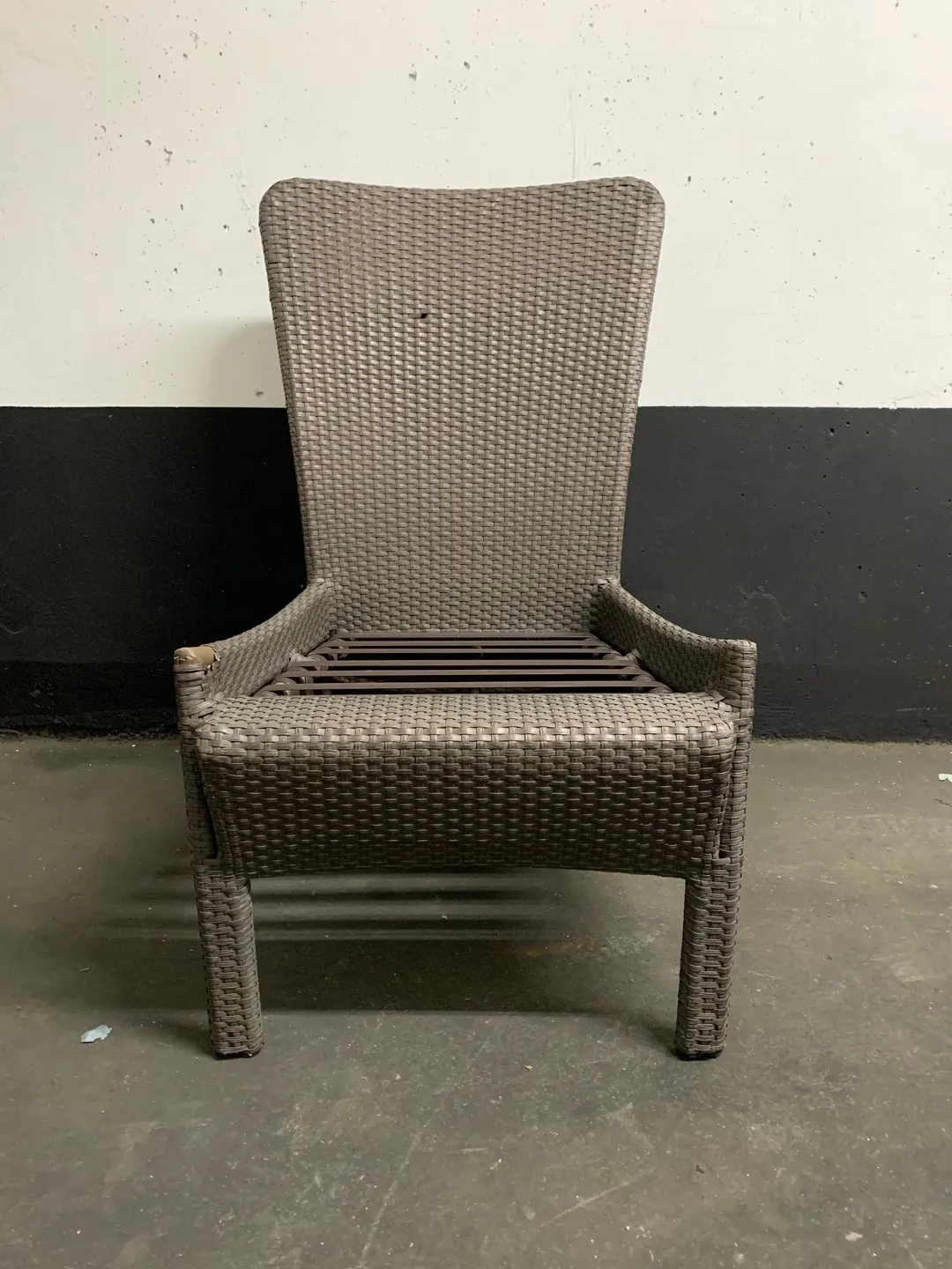 One chair is in used excellent condition, the other (image posted) is in used fair condition. The fair condition chair has a small hole in the back, and some roughage on the front right part of seat, neither causes any issues with function. The excellent condition chair has no blemishes as far as I know. Seat cushions not included.