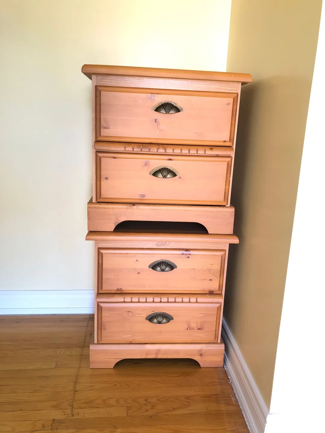 Used but in good condition. The drawers slides easy and no broken pieces. We just have too many lying around.