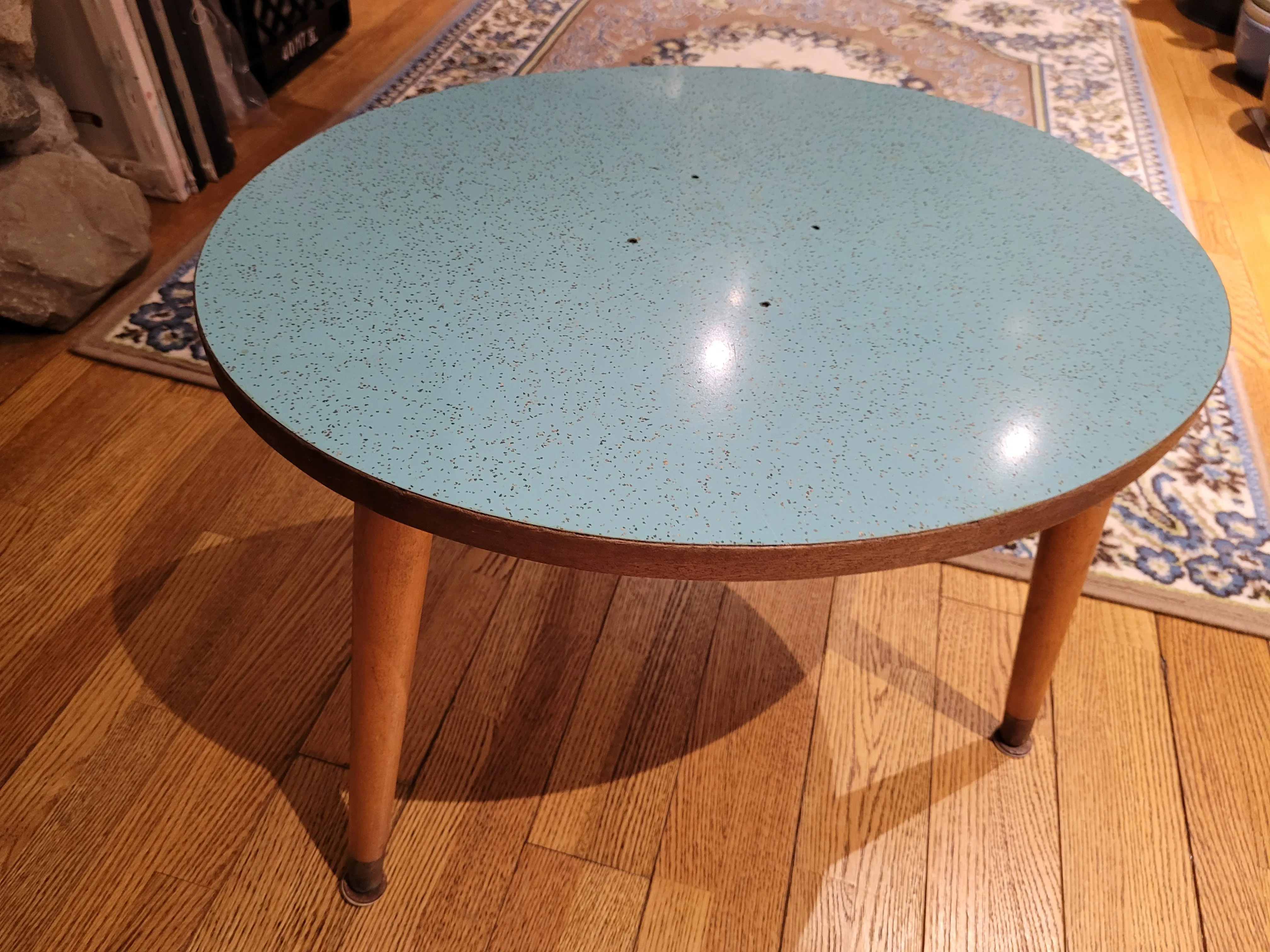 Turquoise top w gold sparkles Has some small holes in the top where it might have had a second level like a plant stand. I have to bring it from home and can trade at my office at 391 attwell drive. During monday to friday 830 to 430