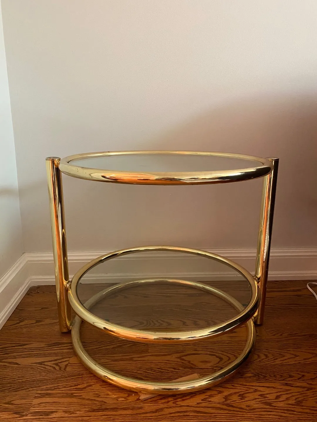 Stunning piece! We no longer have room for it sadly. Features 2 round glass tiers. Solid piece in excellent used condition.
