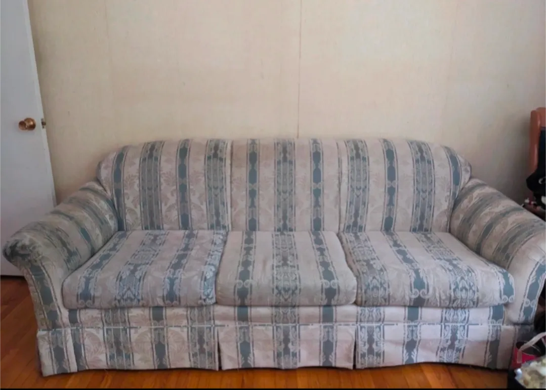 Super comfy classic couch or sofa that seats 4-5 and has a very cool print. 85" wide from armrest to armrest, 37" length from back to front, and about 34" tall.