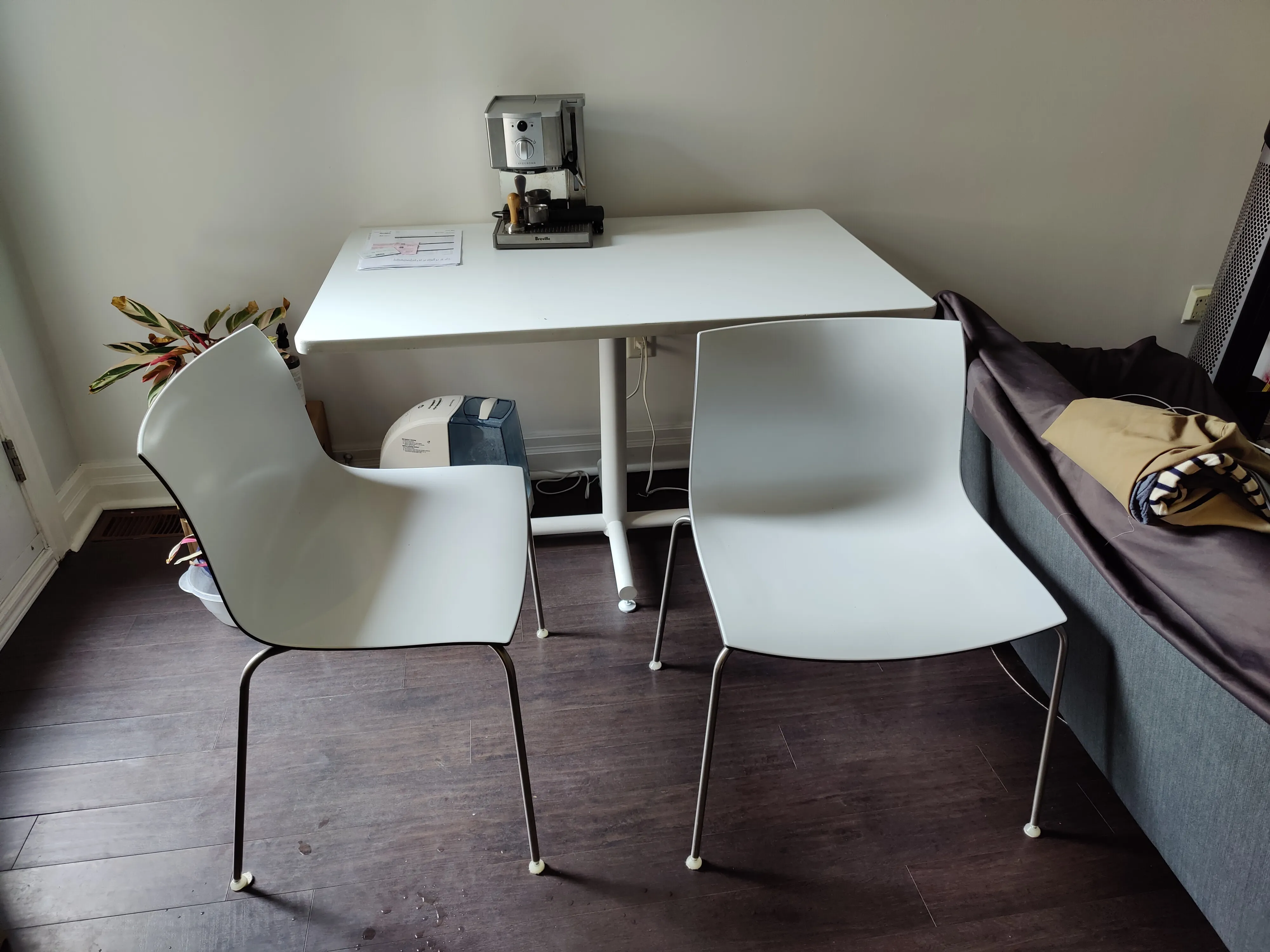 Chairs (x4): chairs are wider than average, but are sturdy with minimal wear. one chair is missing the plastic foot that protects the floor.