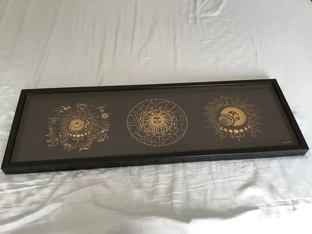 Black and Gold zodiac and moon picture frame. Dimensions are 10W x 30L inches.