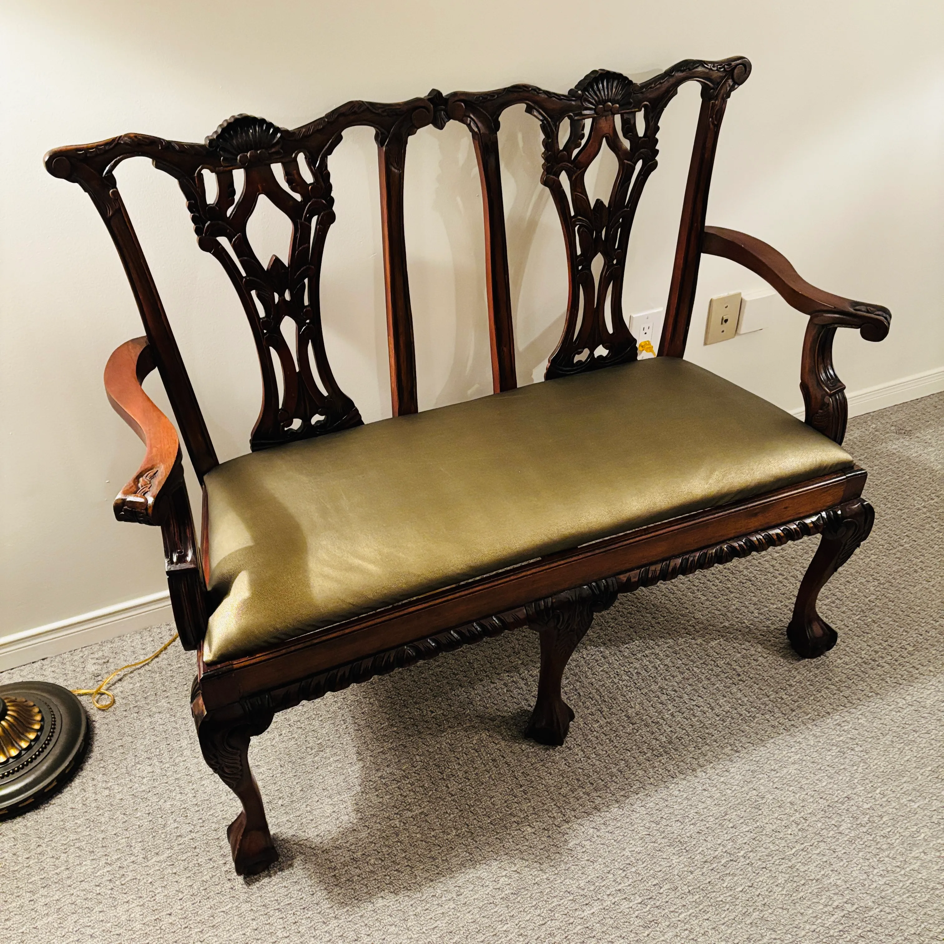 Ornate wood frame is intricately hand carved with beautiful details including dragon claw feet. Very light weight, and the seat quickly removes from the frame for ease of storing, moving, etc. Dimensions in inches are 48 L x 18 W x 39 H. This is the nicest Chippendale I’ve seen, and a deal as most go for 3k.