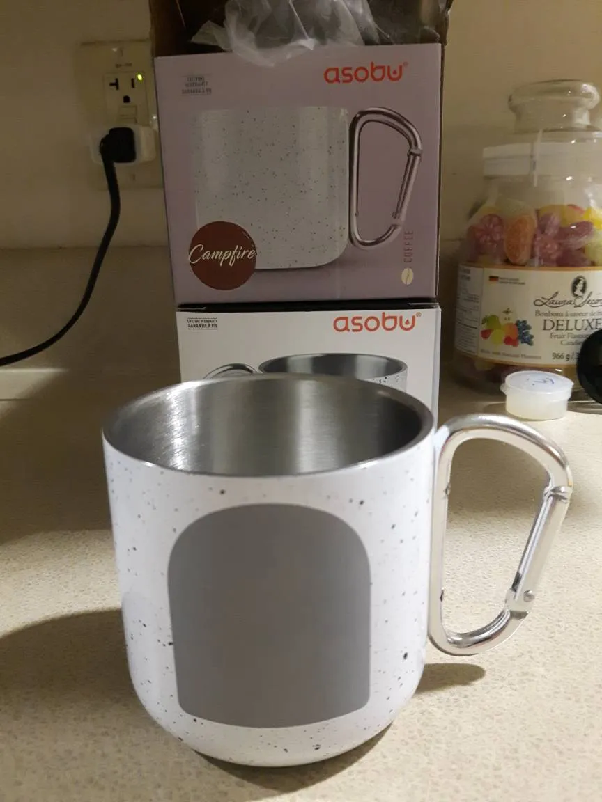 ASOBU STAINLESS STEEL COFFEE MUG 12 OZ / 360 ML CARABINER HANDLE DOUBLE WALL VACUUM INSULATION MAINTAINS THE TEMPERATURE HOT OR COLD KEEPS OUTER WALL DRY, NO MESSY MOISTURE AND COMFORTABLE TEMPERATURE WHITE AND GREY DOTS BNIB TOOK OUT TO TAKE PICS ONLY $30. EACH I HAVE 2 LOOKING FOR 925 JEWELRY OR ALCOHOL OR MAKE ME AN OFFER CASH TRADE TOGETHER OR SEPARATE