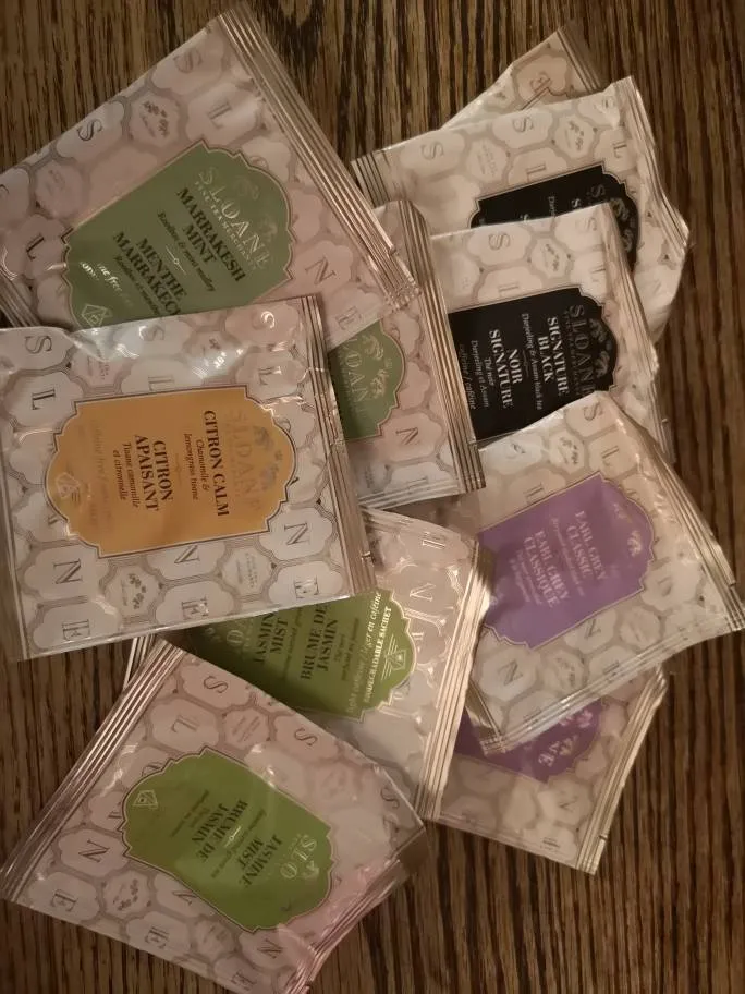 Sloane tea Black, earl gray, jasmine. 3 bags of each.